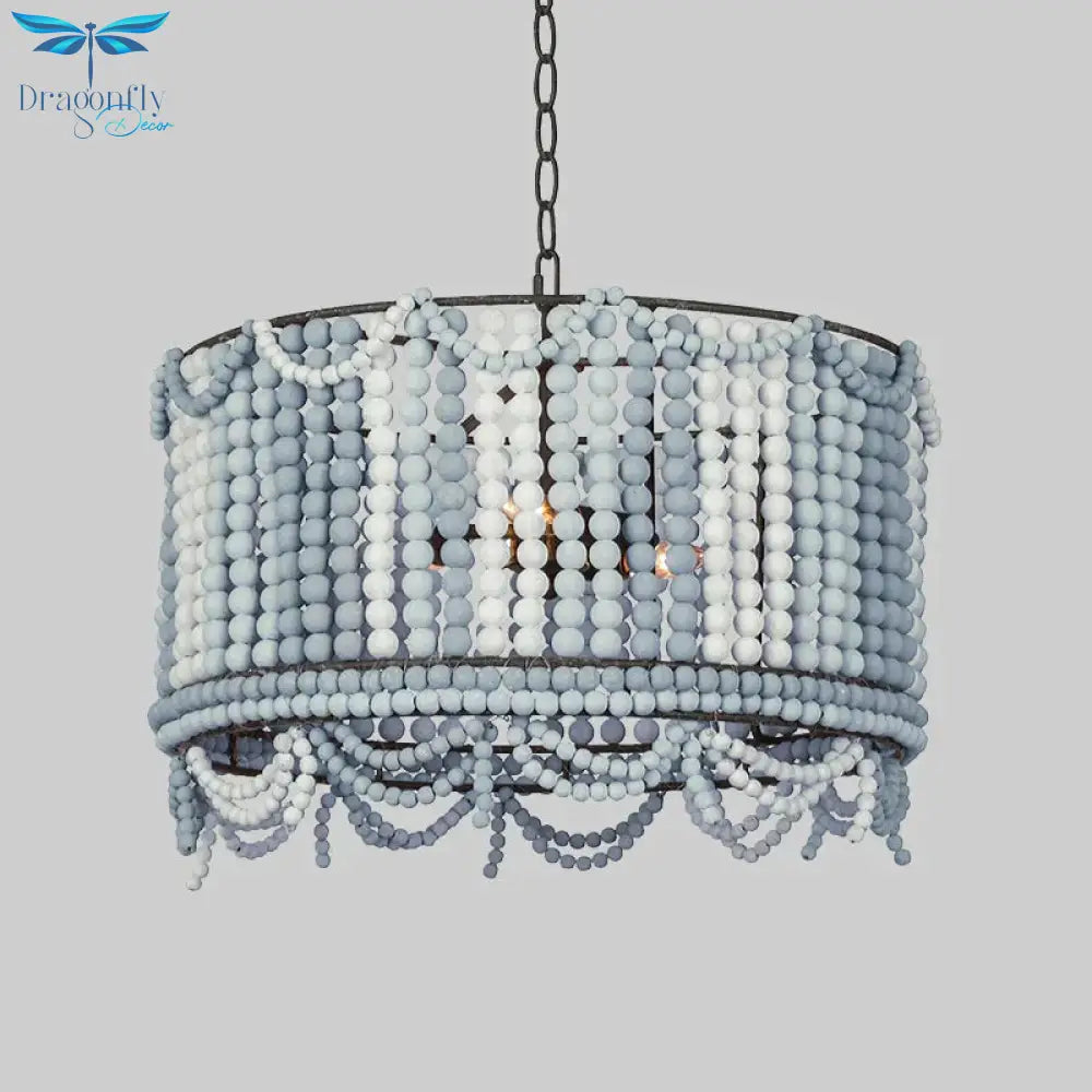 Wood Drum Chandelier Lamp Retro 3 Bulbs White/Pink/Blue Pendant Lighting Fixture with Adjustable Chain