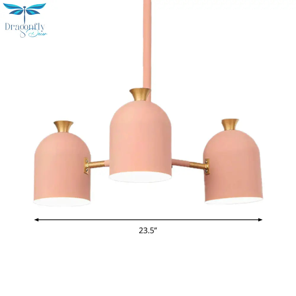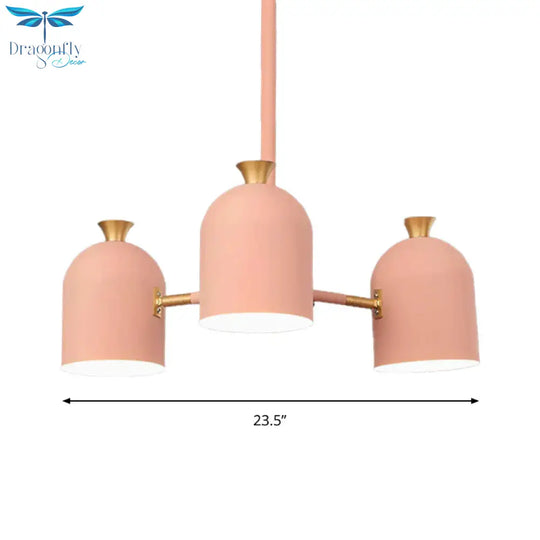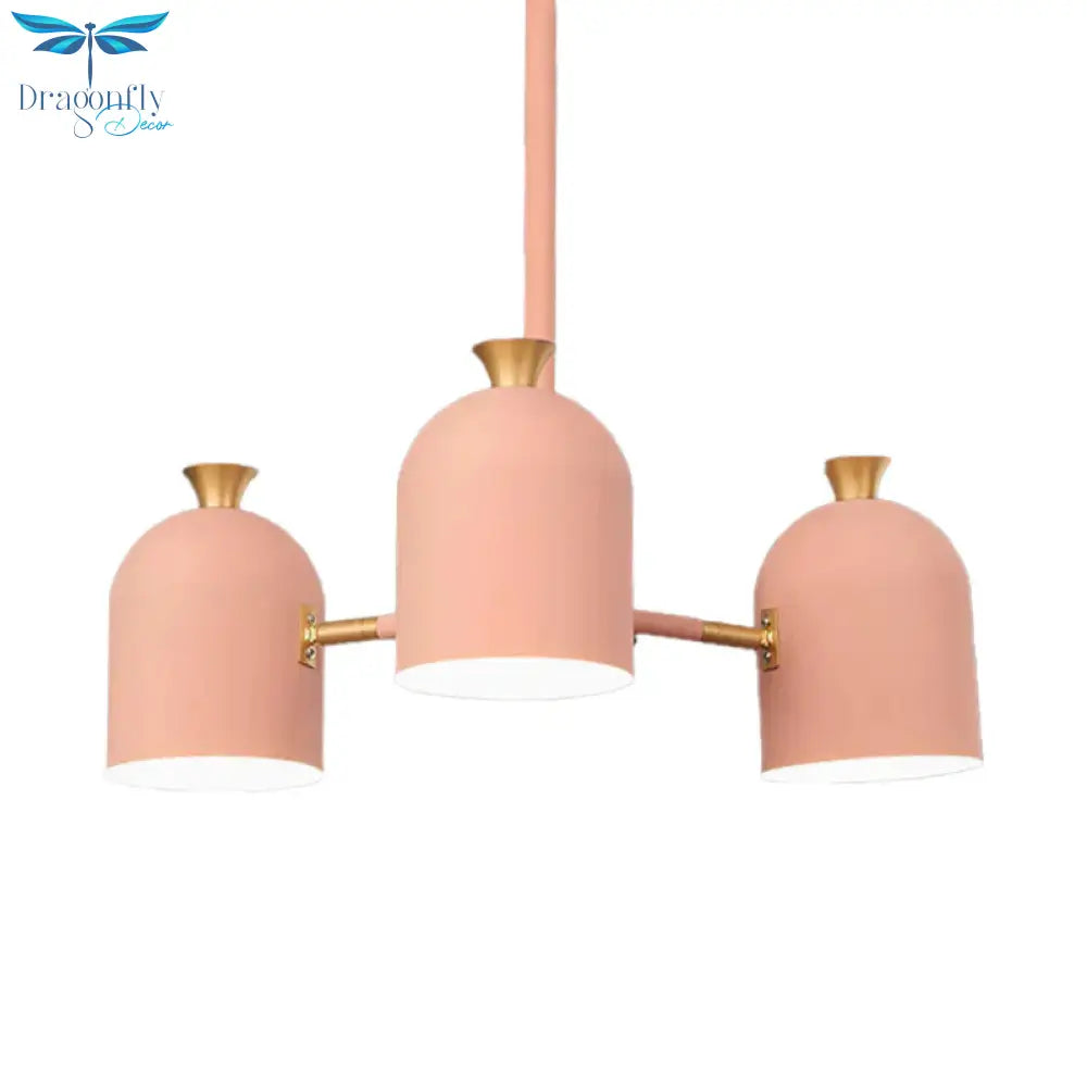 3 Lights Cup Hanging Light Macaron Style Metal Chandelier in Pink for