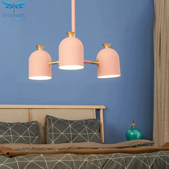 3 Lights Cup Hanging Light Macaron Style Metal Chandelier in Pink for Girls Bedroom