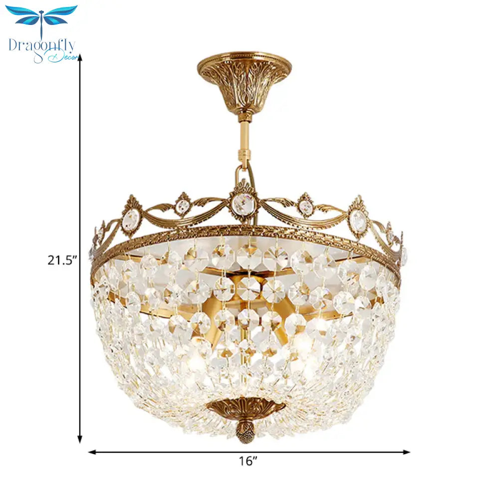 Traditional Bowl Hanging Chandelier Crystal 4 Bulbs Suspension Light in Brass for Hallway