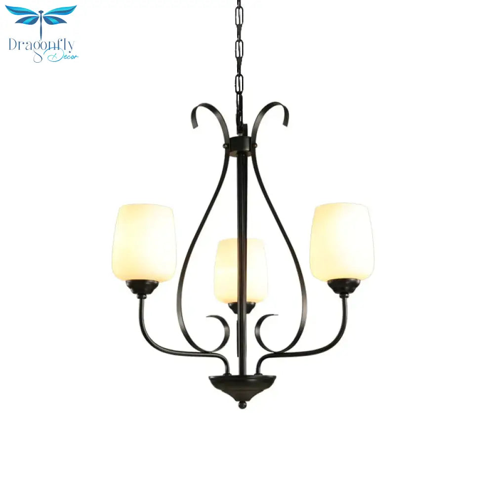 Cream Glass Tulip Chandelier Lamp Vintage 3/6/8 Bulbs Dining Room Pendant in Black with Raindrop Cage