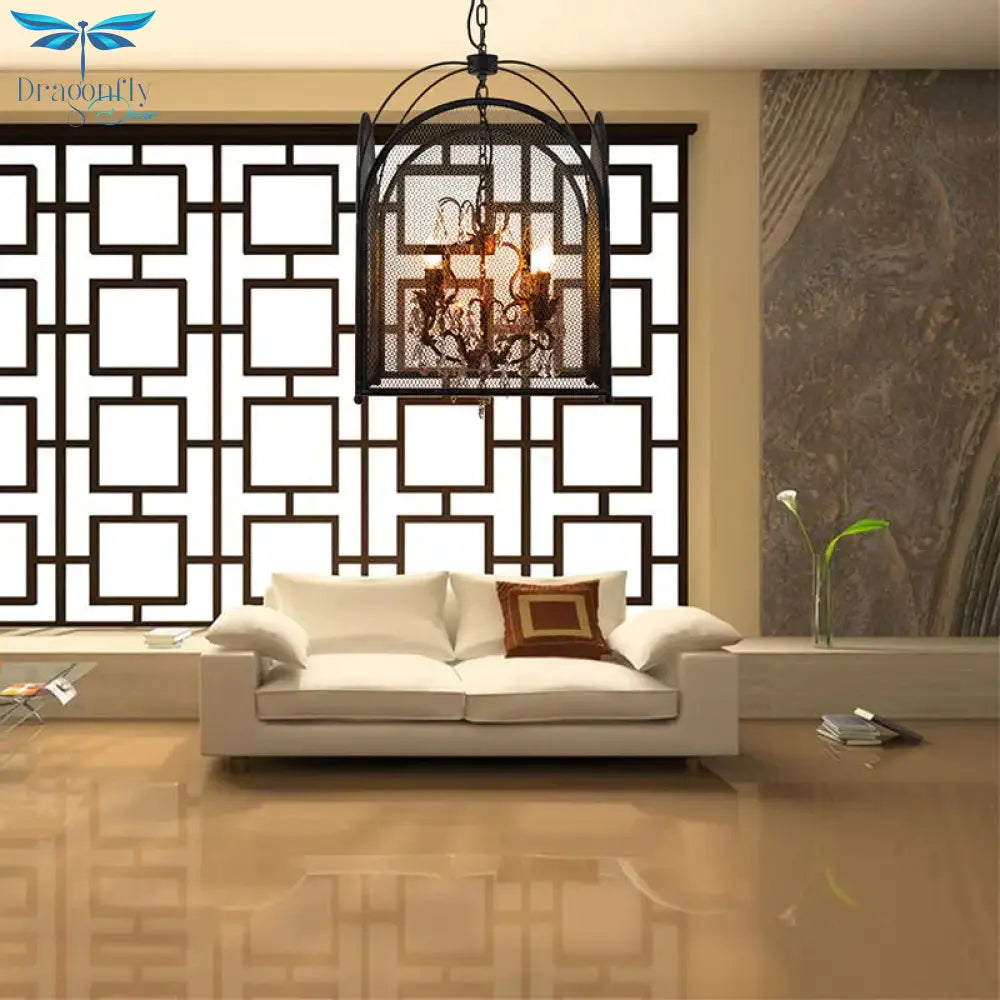 Vintage Candle Hanging Pendant 4 Lights Metal Ceiling Chandelier in Black with Crystal Drop
