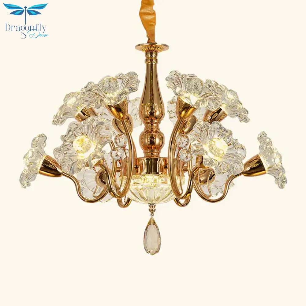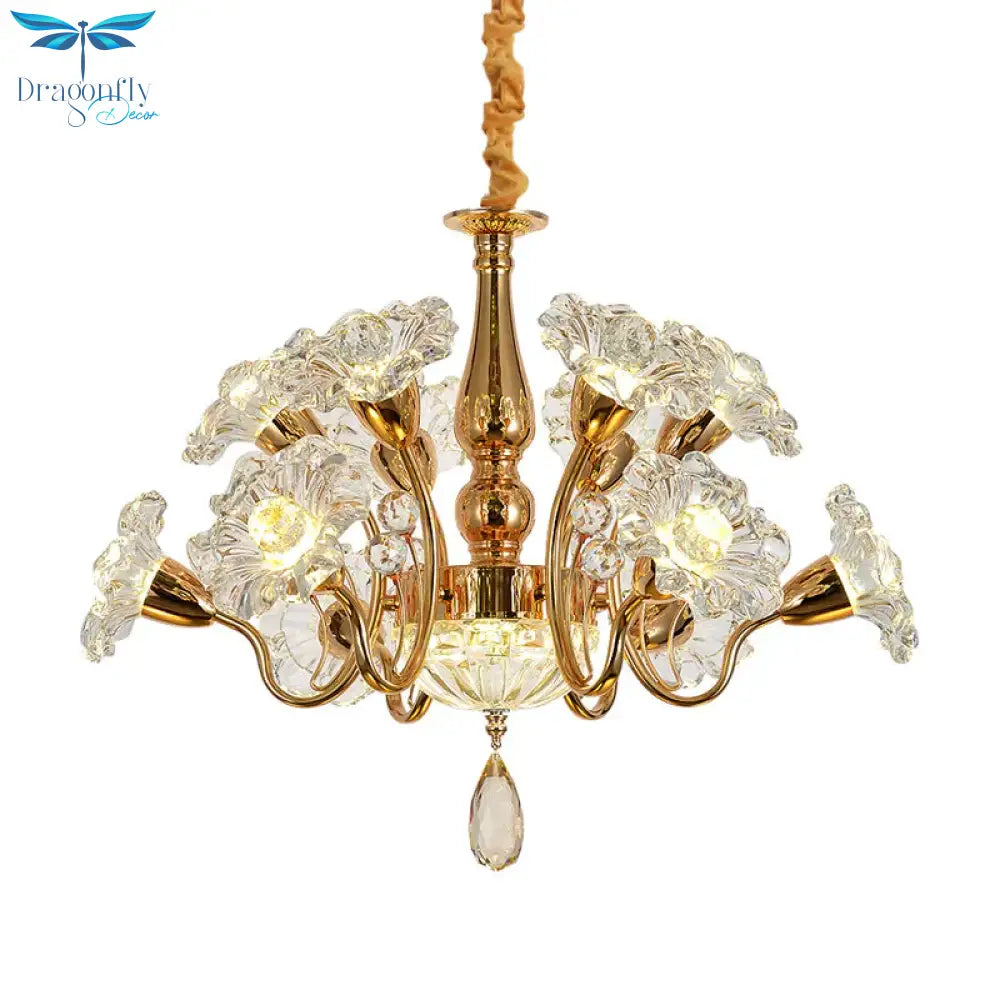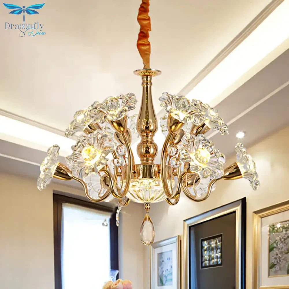 12 Bulbs Swirled Arm Chandelier Traditional Gold Clear 2-Tier Crystal Flower Shade Ceiling Light
