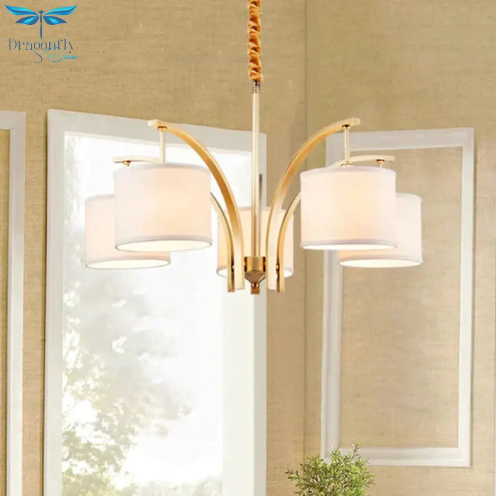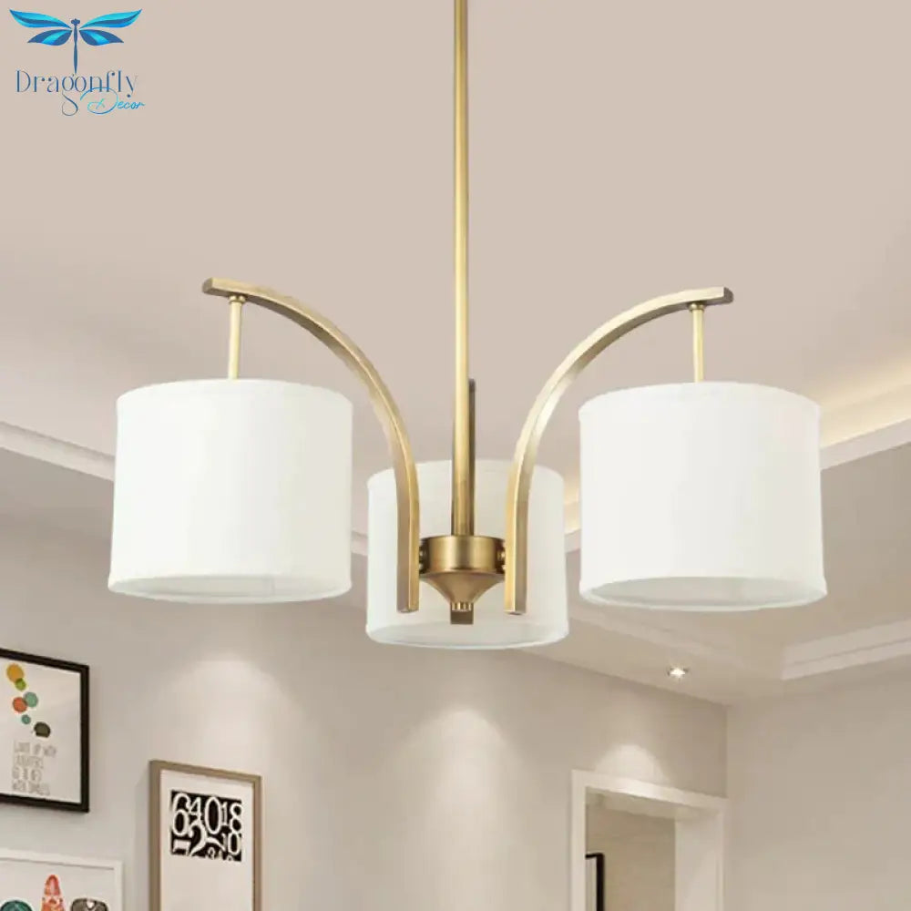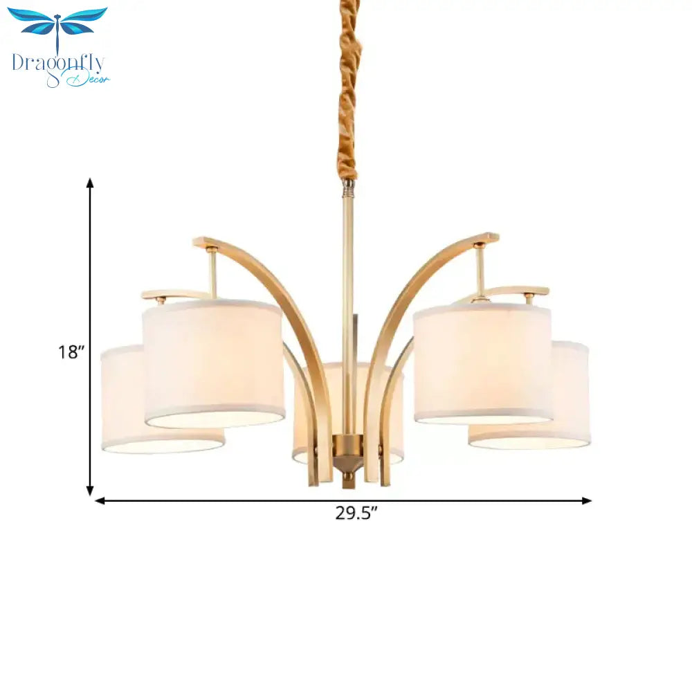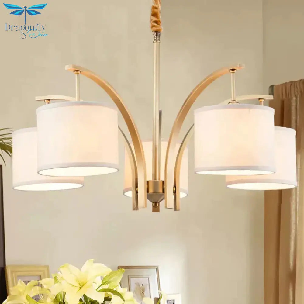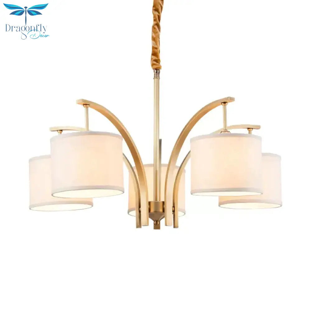 3/5 Bulbs Chandelier Lighting Country Drum Shade Fabric Hanging Lamp in Gold with Metal Curved Arm