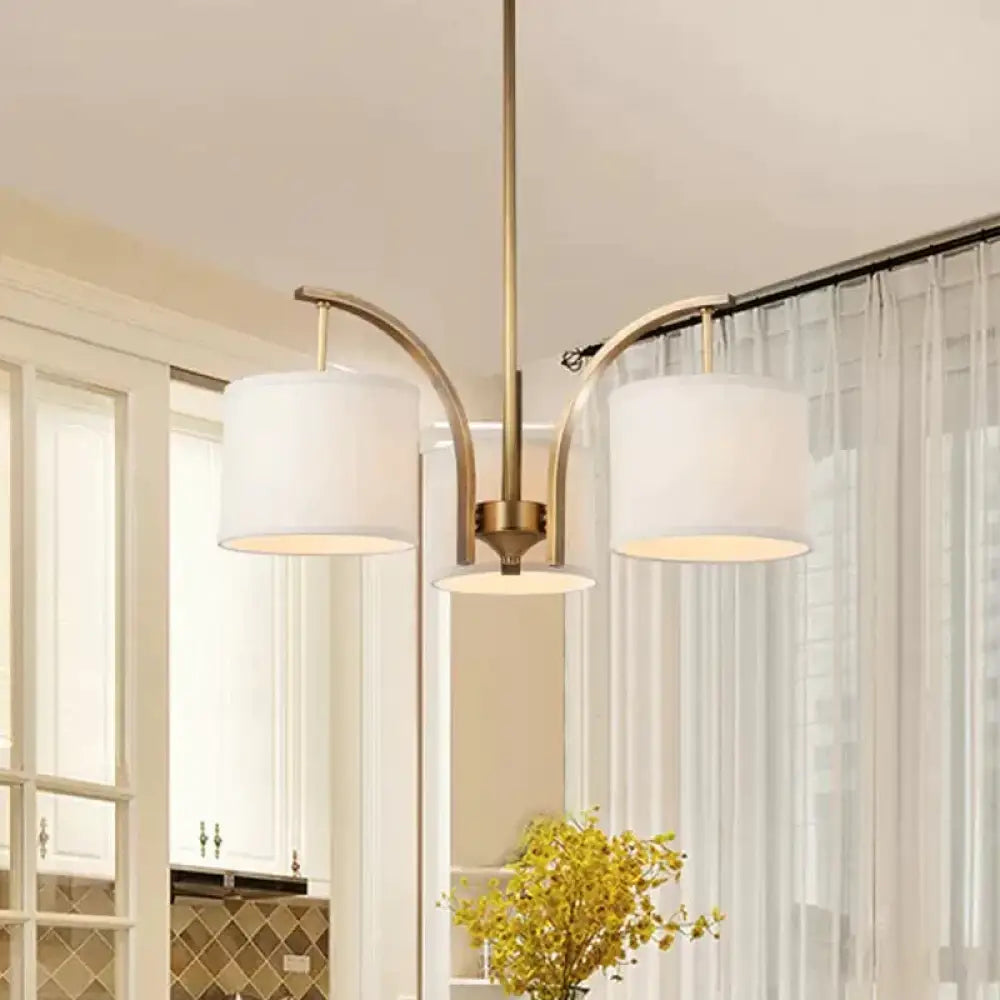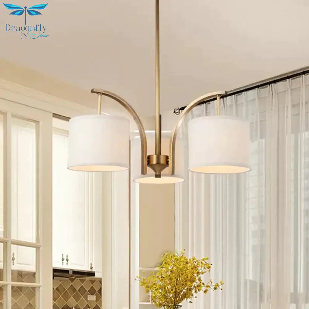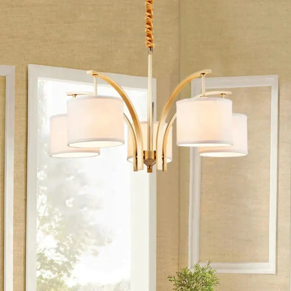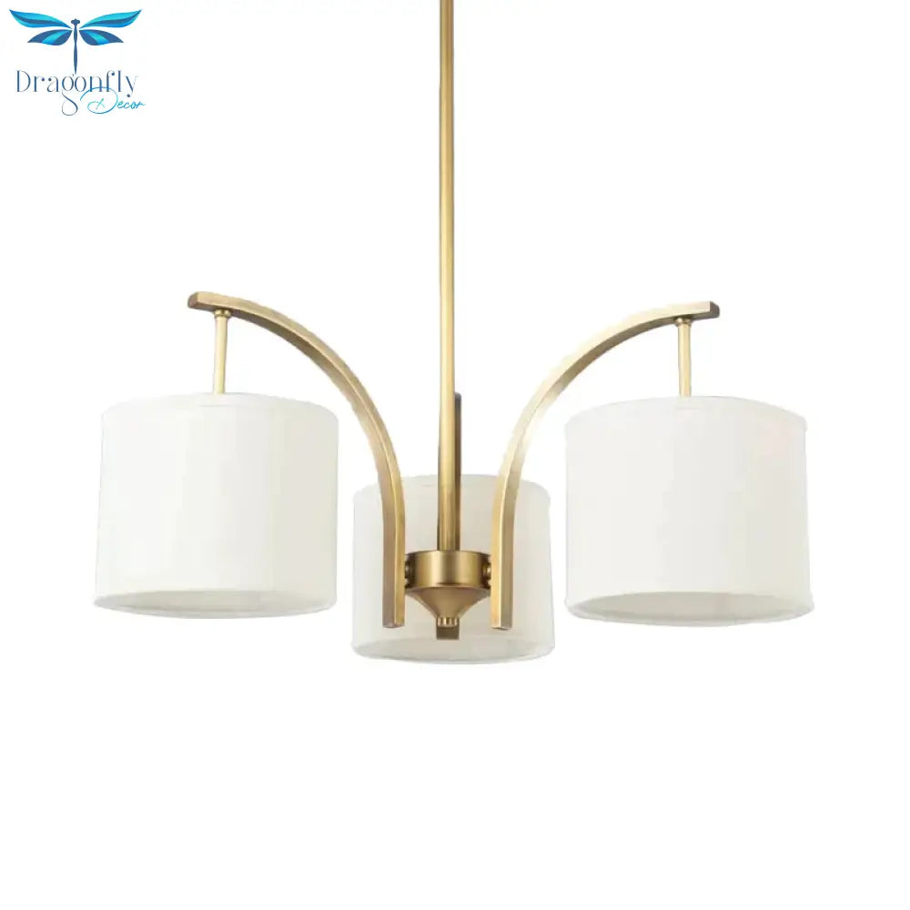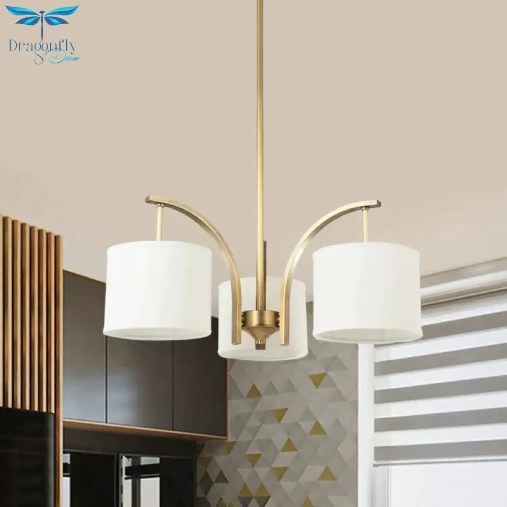 3/5 Bulbs Chandelier Lighting Country Drum Shade Fabric Hanging Lamp in Gold with Metal Curved Arm
