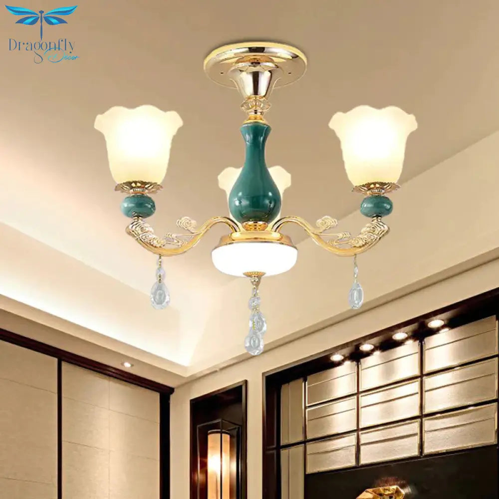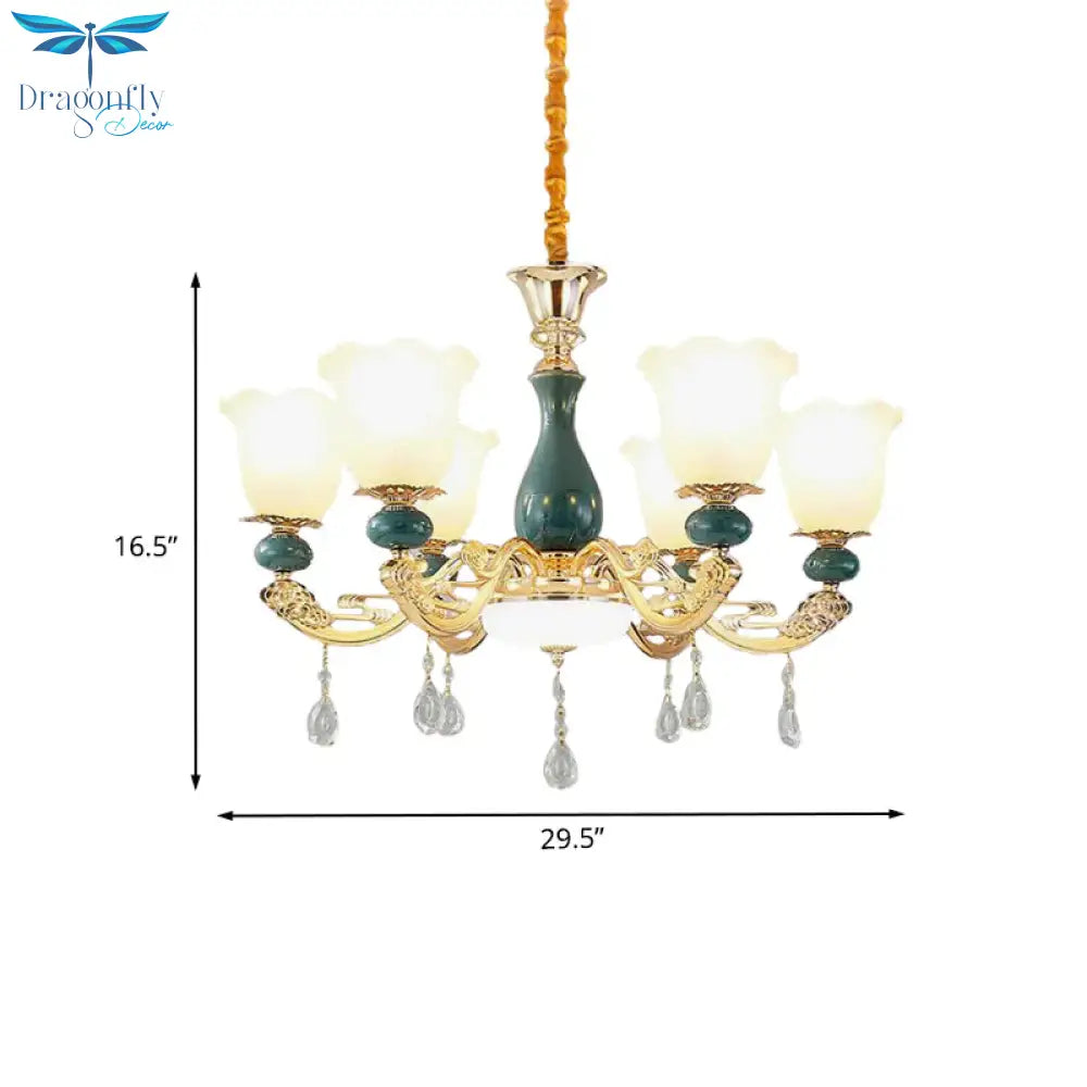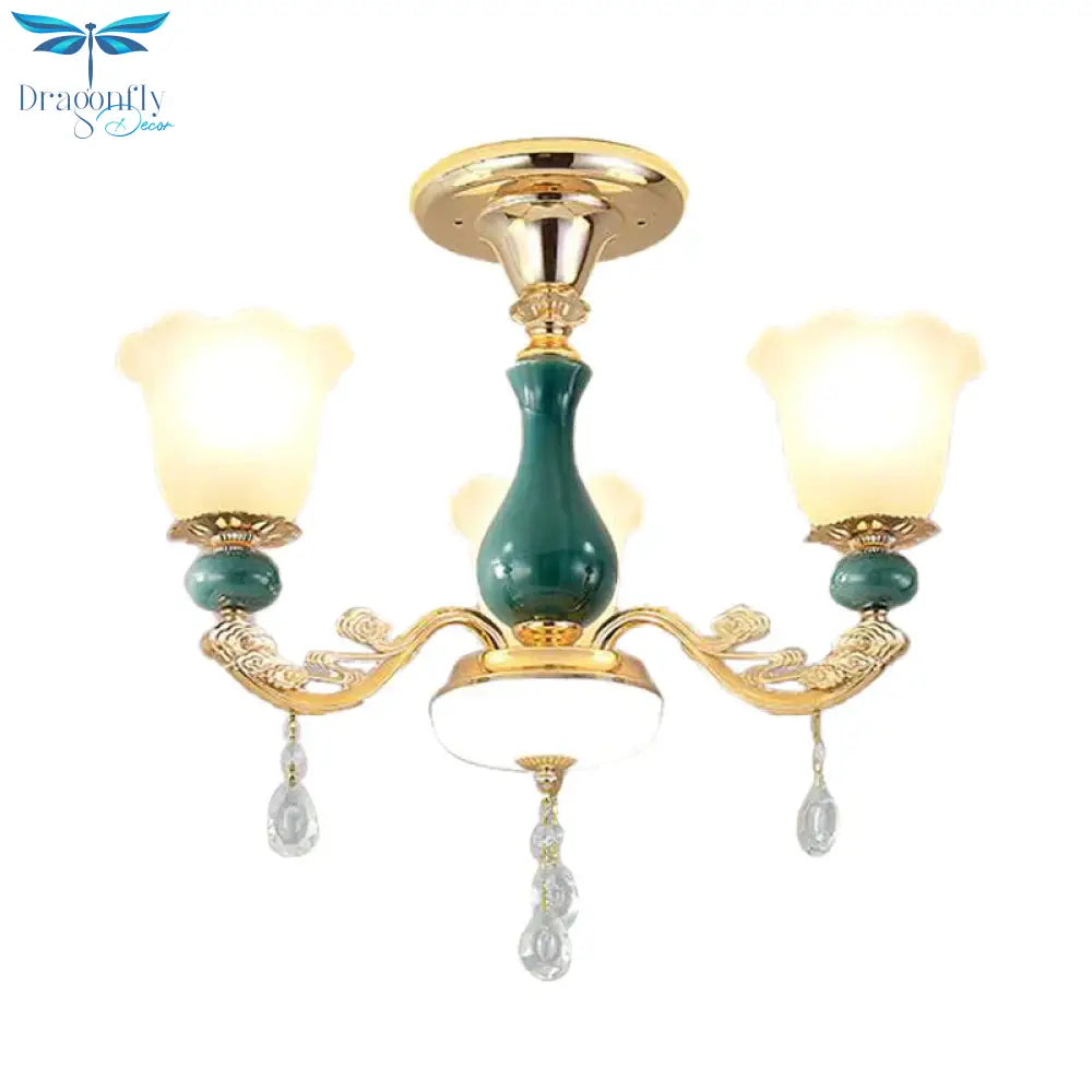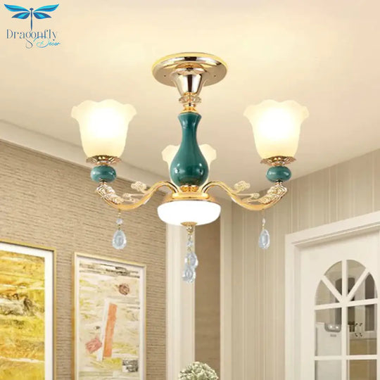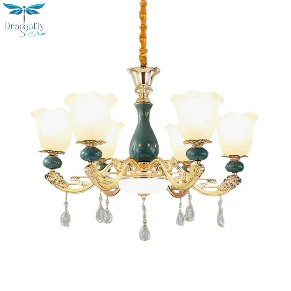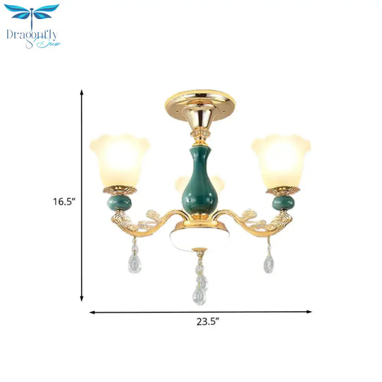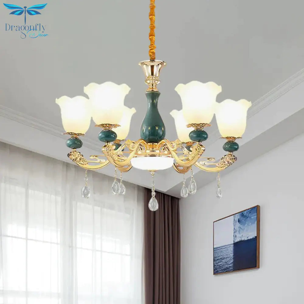 3/6 Bulbs Up Suspension Lamp Classic Flower Opal Glass Pendant Chandelier with Scrolled Arm in Green for Living Room