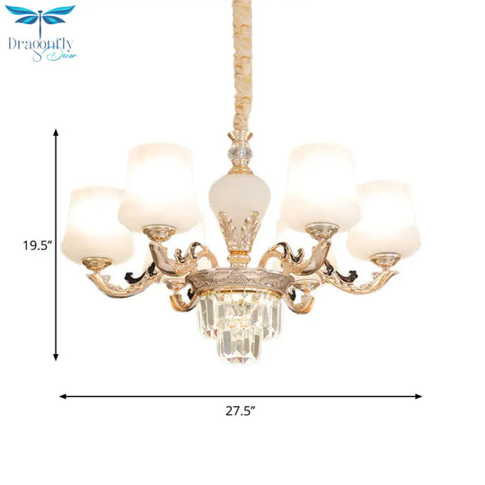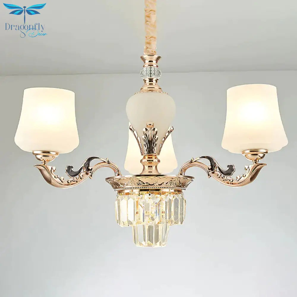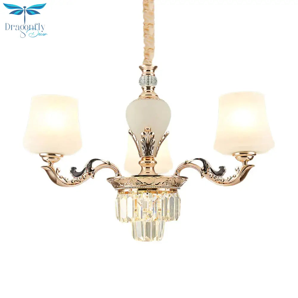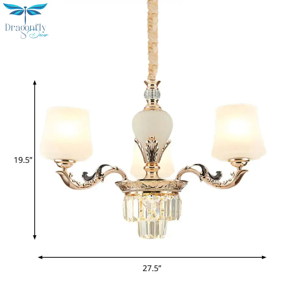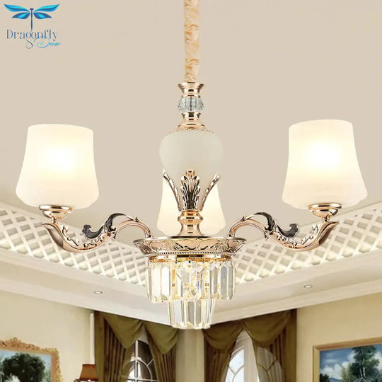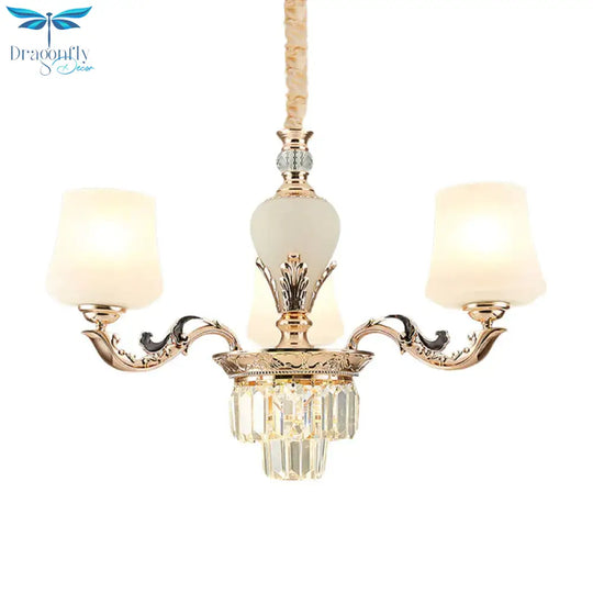 3/6 Heads Ceiling Light with Tapered Shade White Glass Traditional Bedchamber Chandelier Lamp in Gold