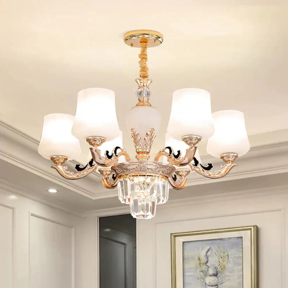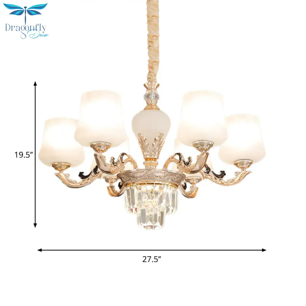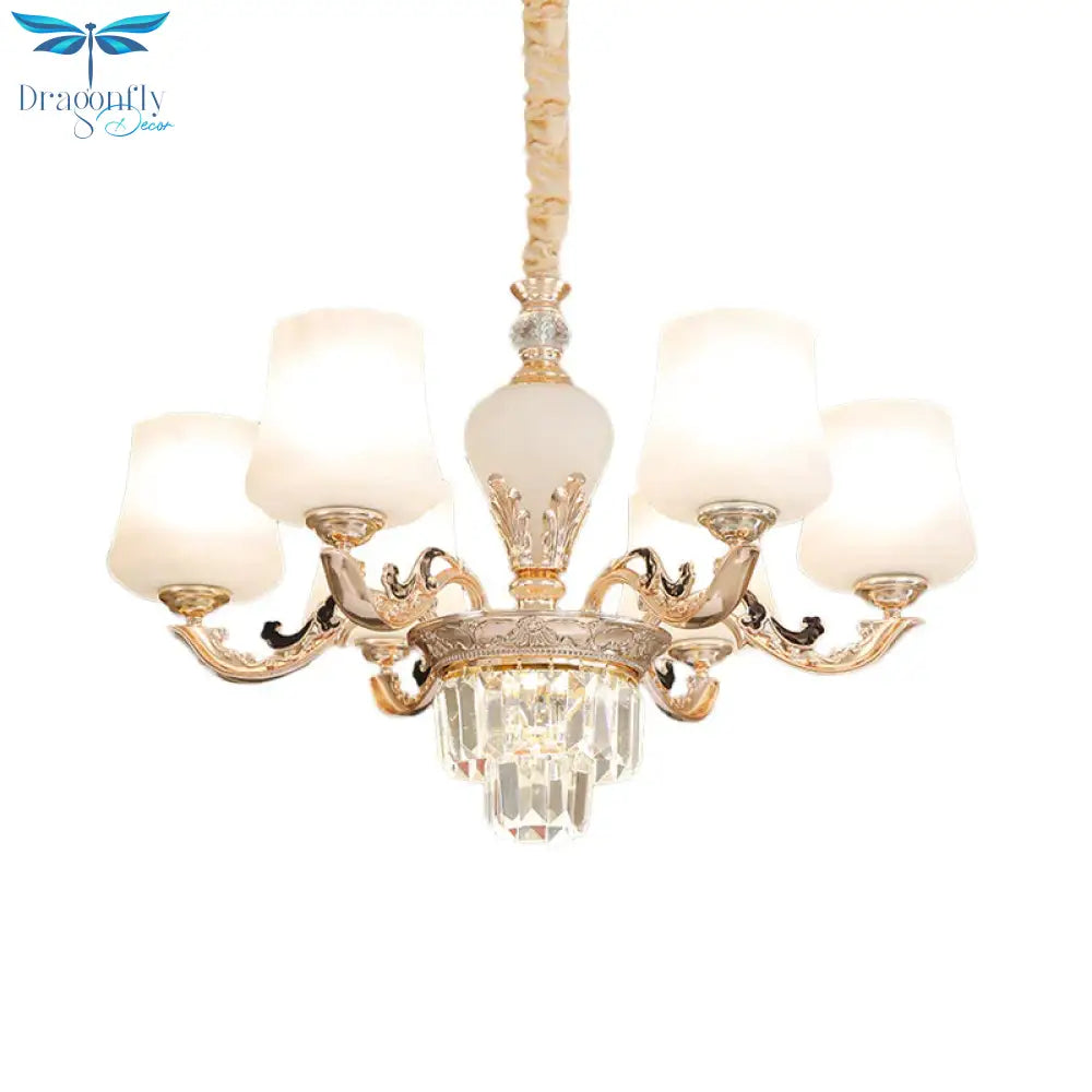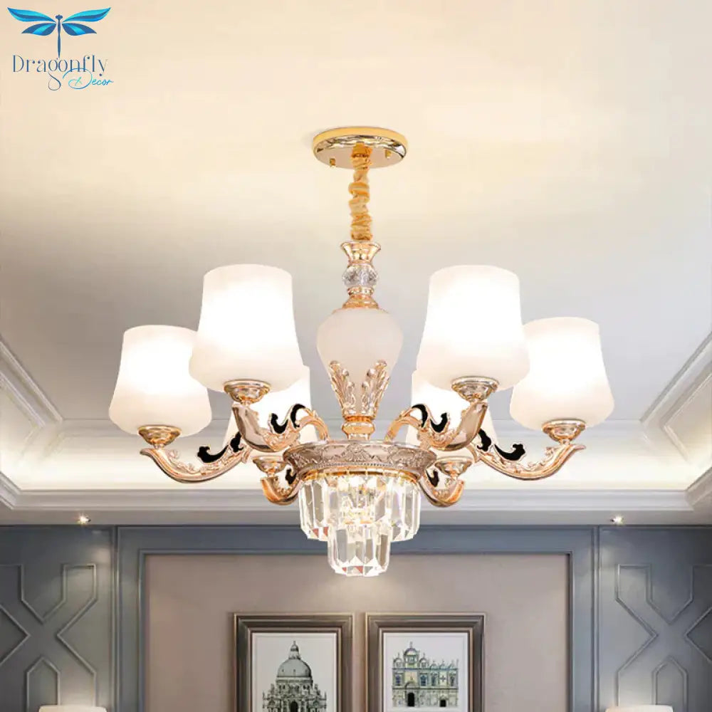 3/6 Heads Ceiling Light with Tapered Shade White Glass Traditional Bedchamber Chandelier Lamp in Gold