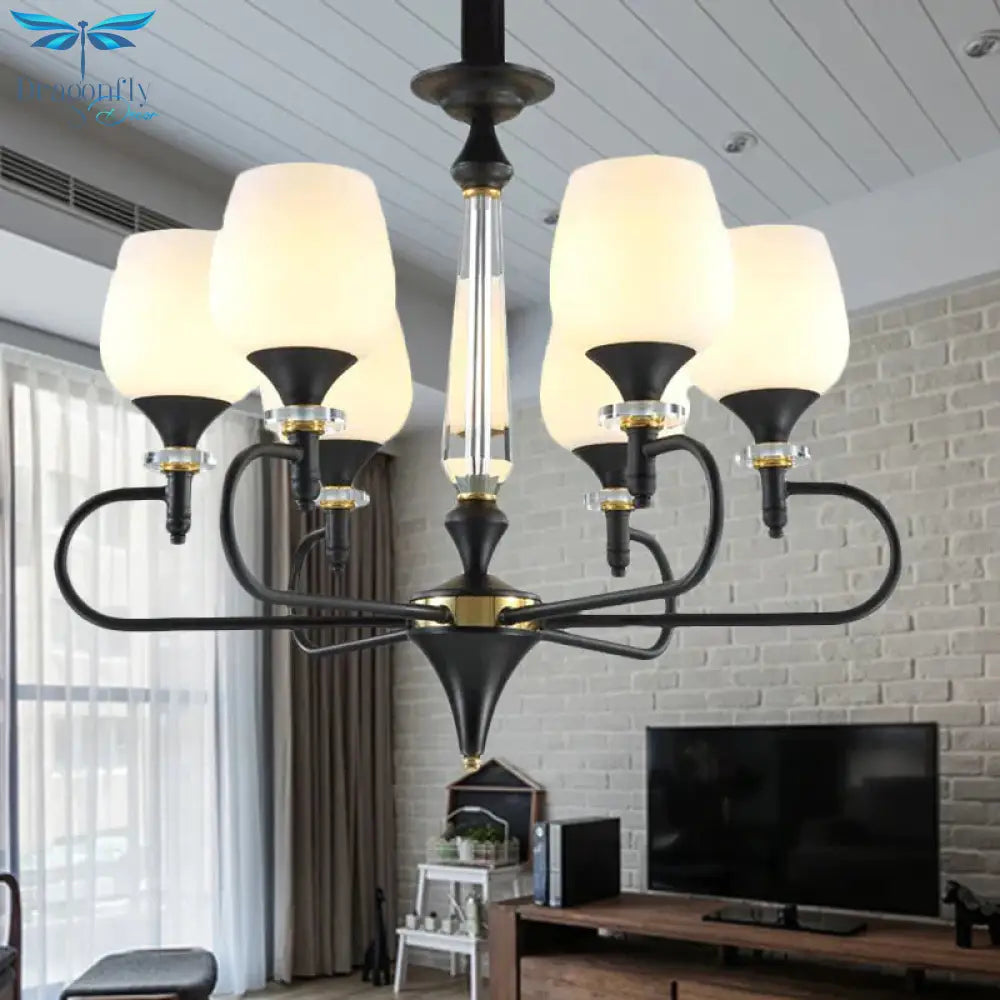 3/6 Lights Opal Glass Hanging Chandelier Traditional Matte Black Cone Living Room Pendant Light Fixture