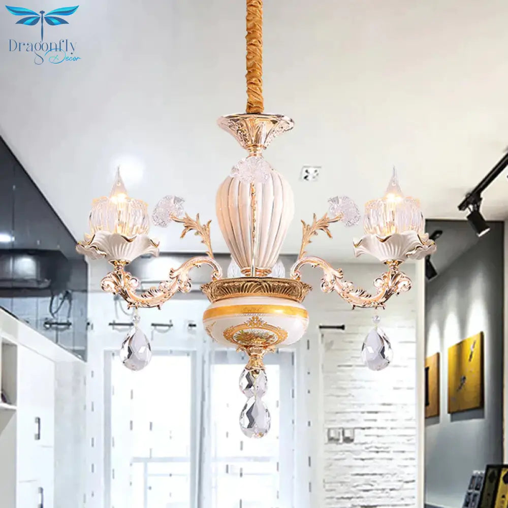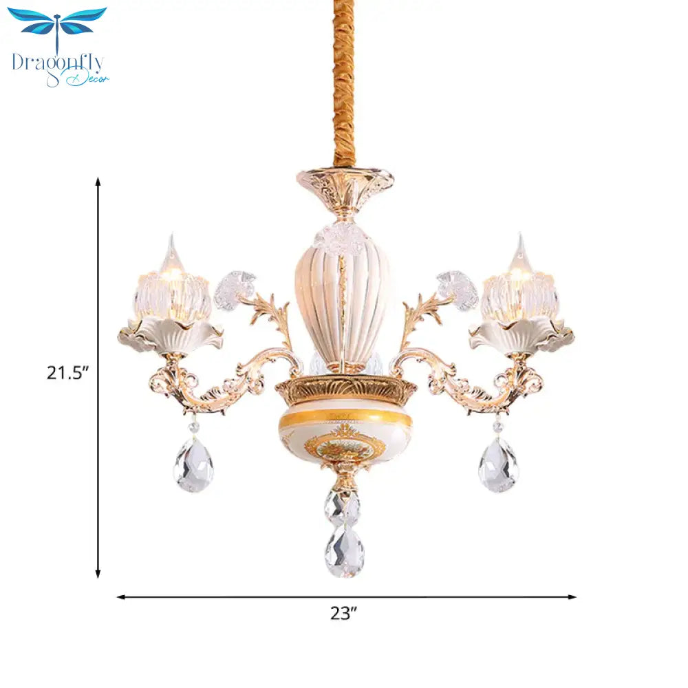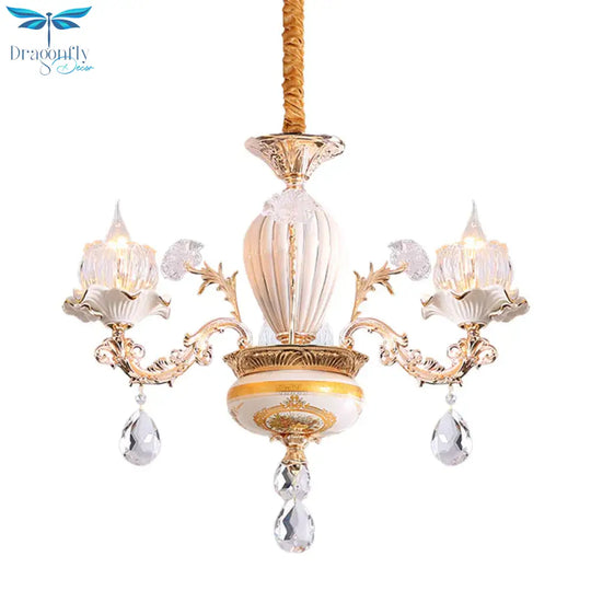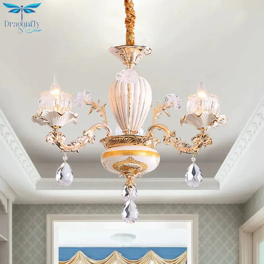 3 Bulbs Ceiling Chandelier Postmodern Flower Buds Crystal Hanging Light with Ceramic Accent, Gold