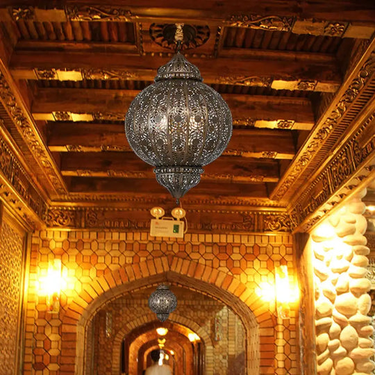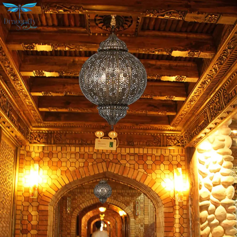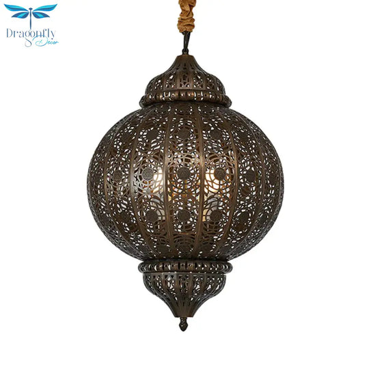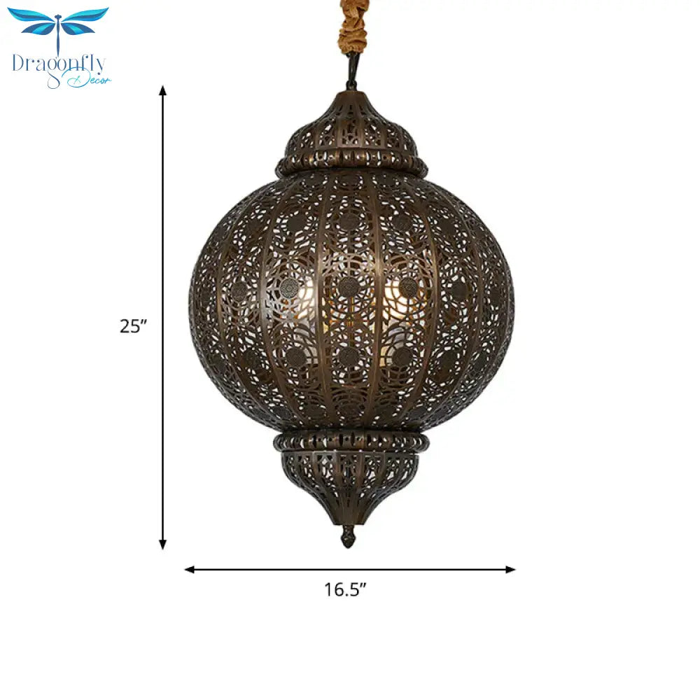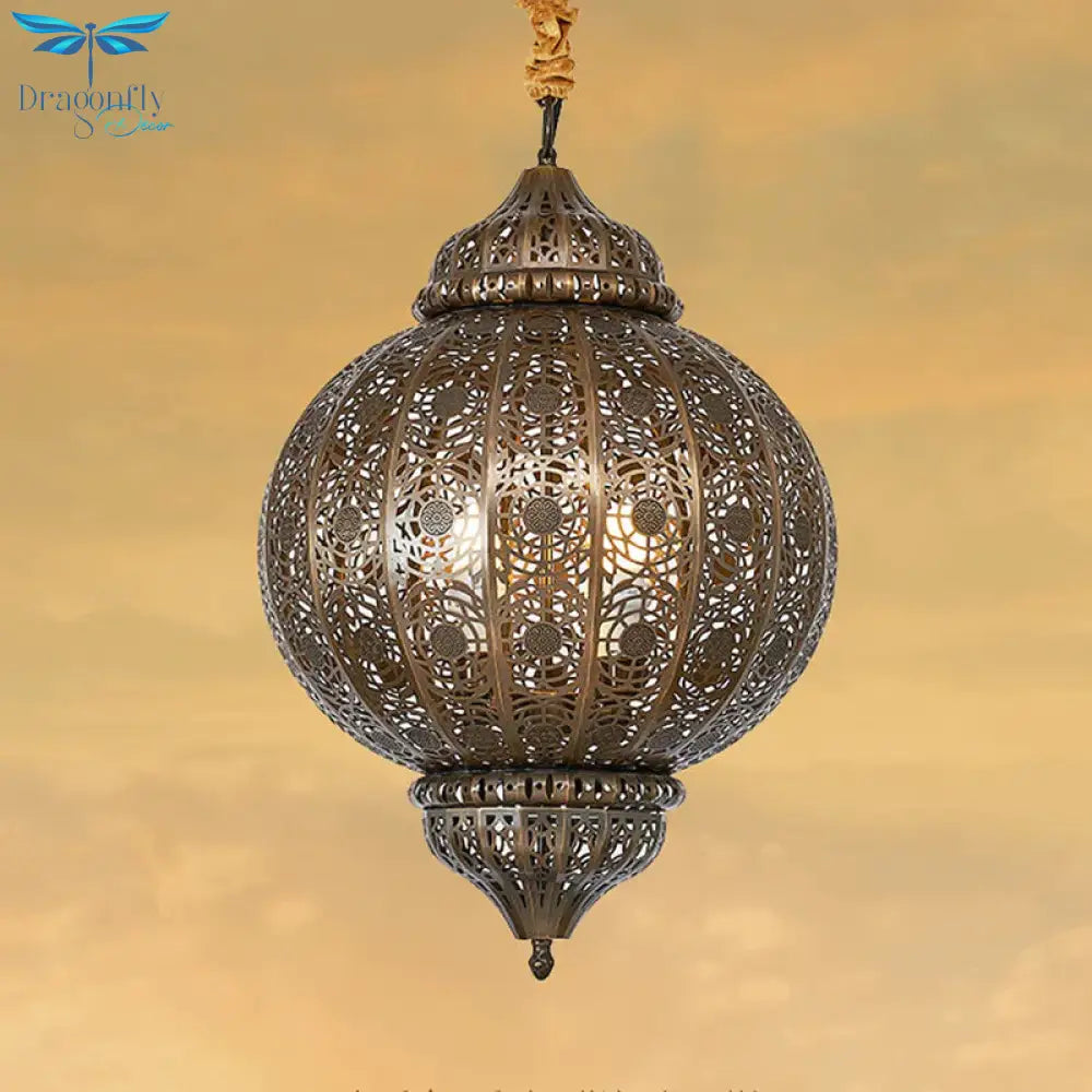 3 Heads Metal Suspension Light Country Bronze Finish Etched Sphere Corridor Chandelier