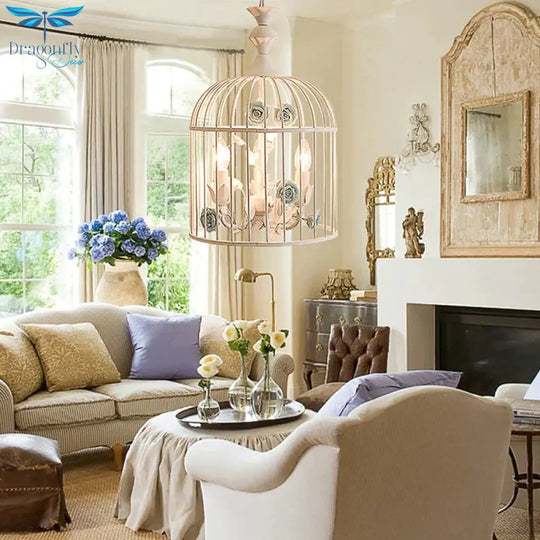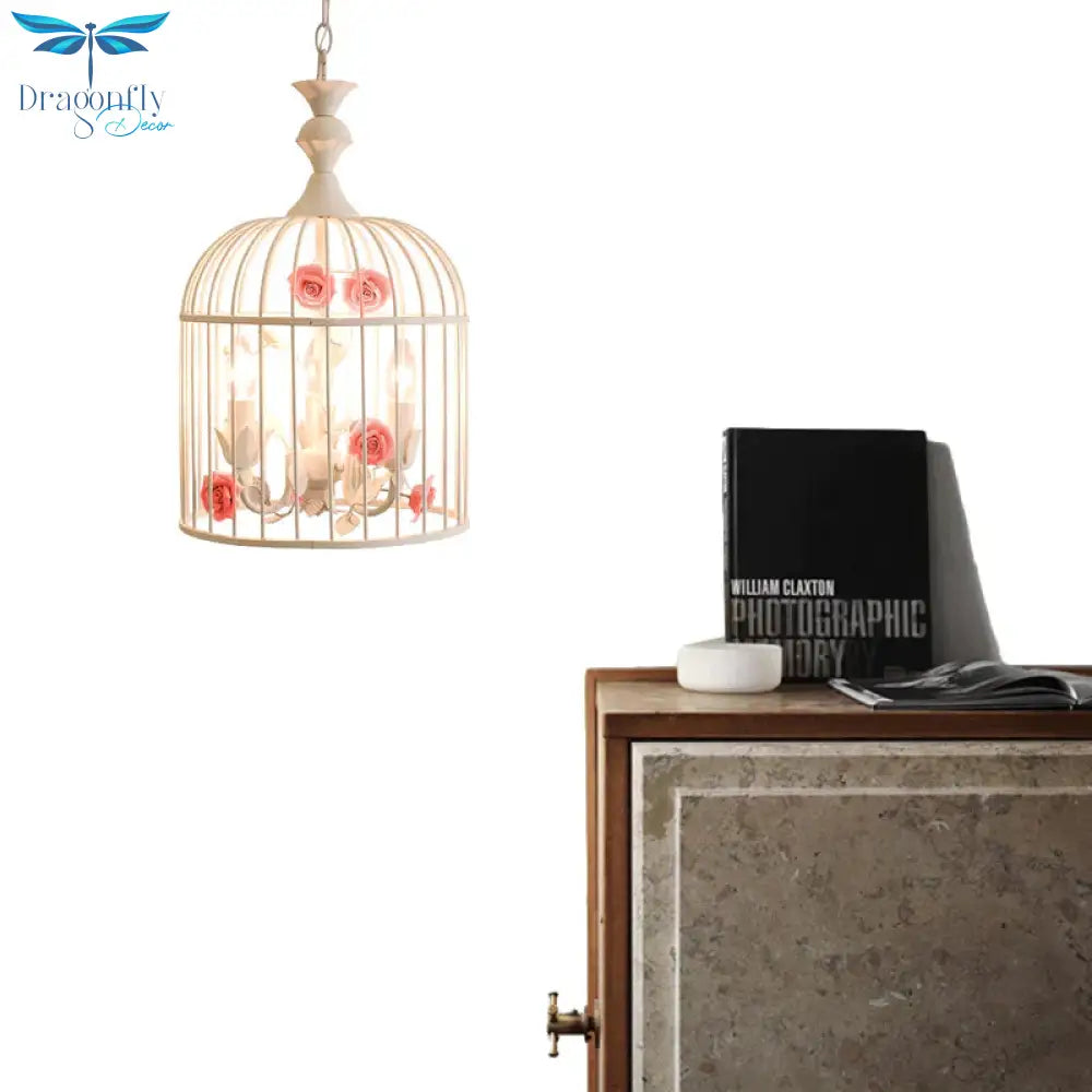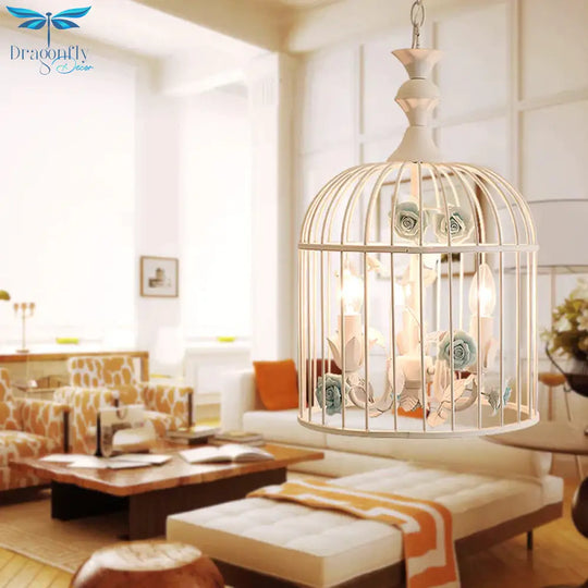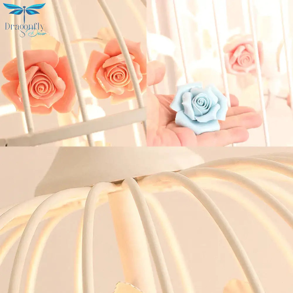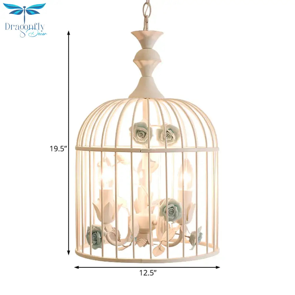 3 Lights Chandelier Light Rustic Birdcage Metal Hanging Ceiling With Blue/Pink Flower Decoration