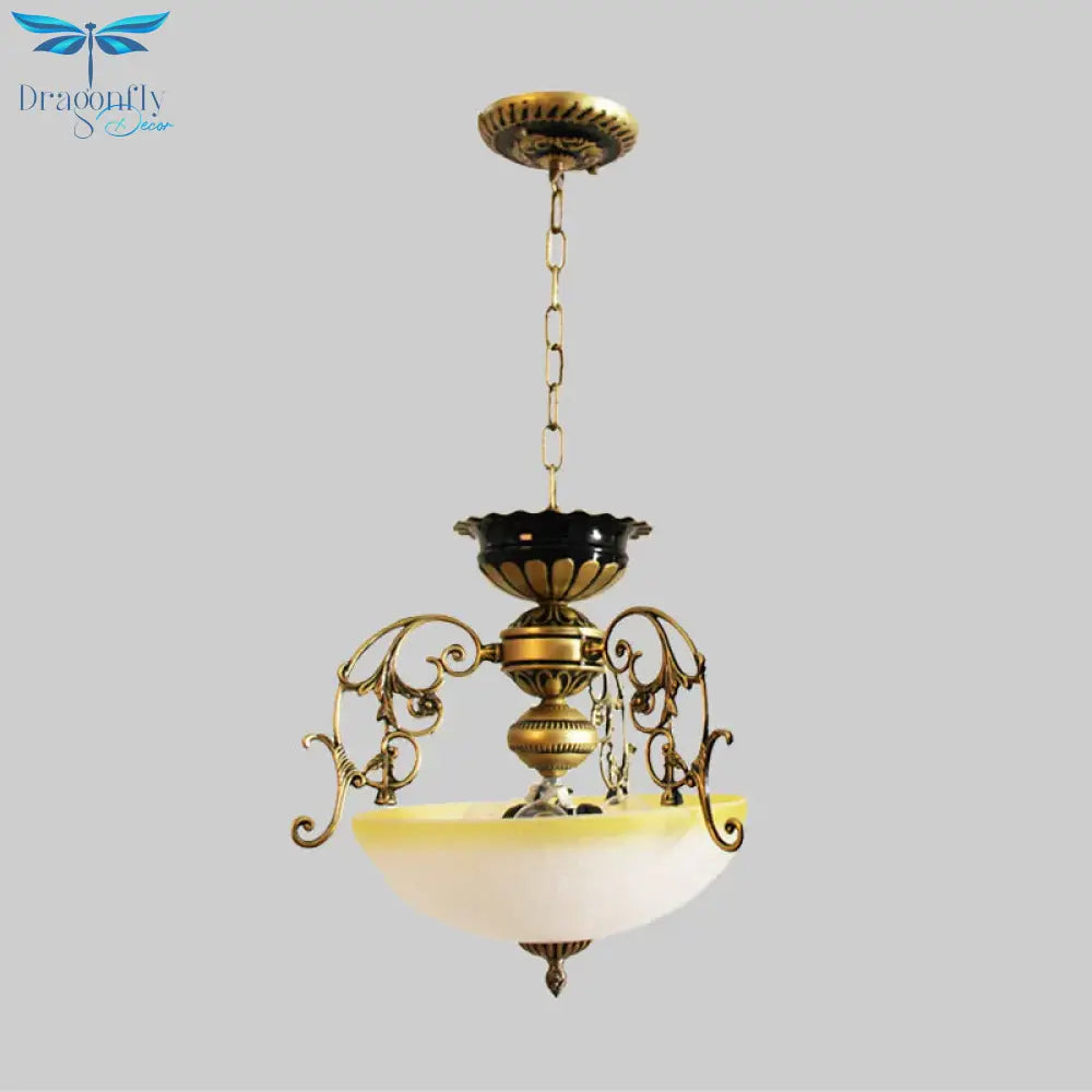 3 Lights Pendant Chandelier Country Bowl-Like Milk Glass Pendulum Lighting with Branch Decor in Bronze