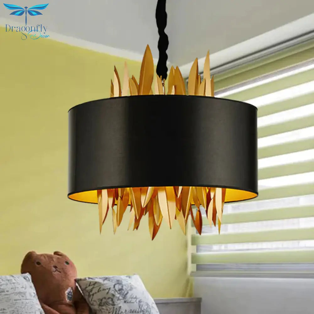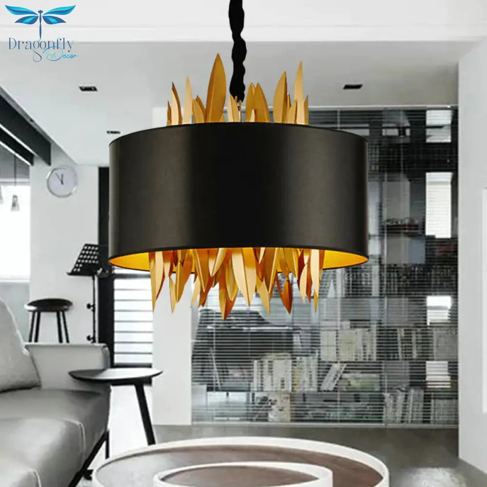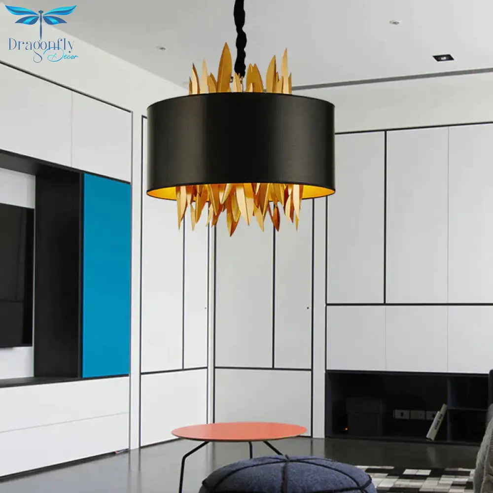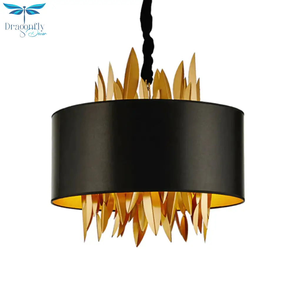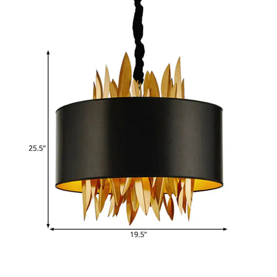 4 Lights Fabric Chandelier Lamp Country Black Round Dining Room Hanging Ceiling Light with Metal Leaves
