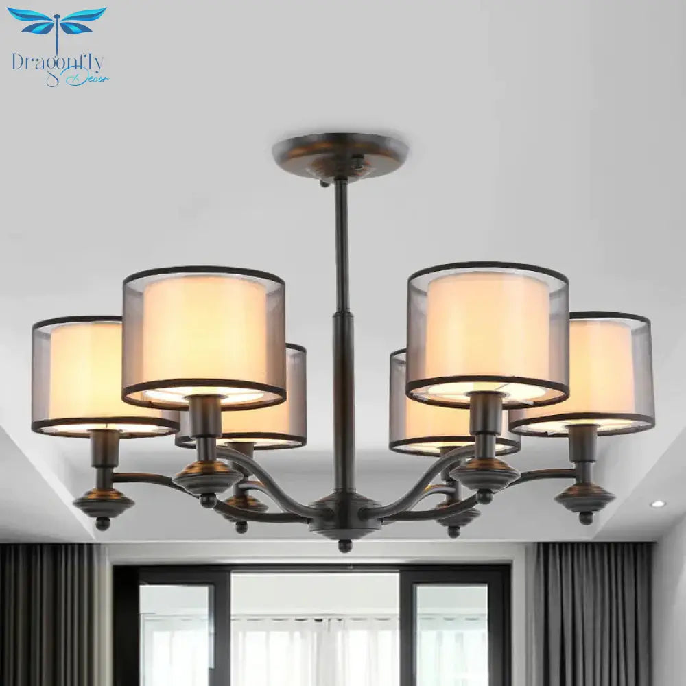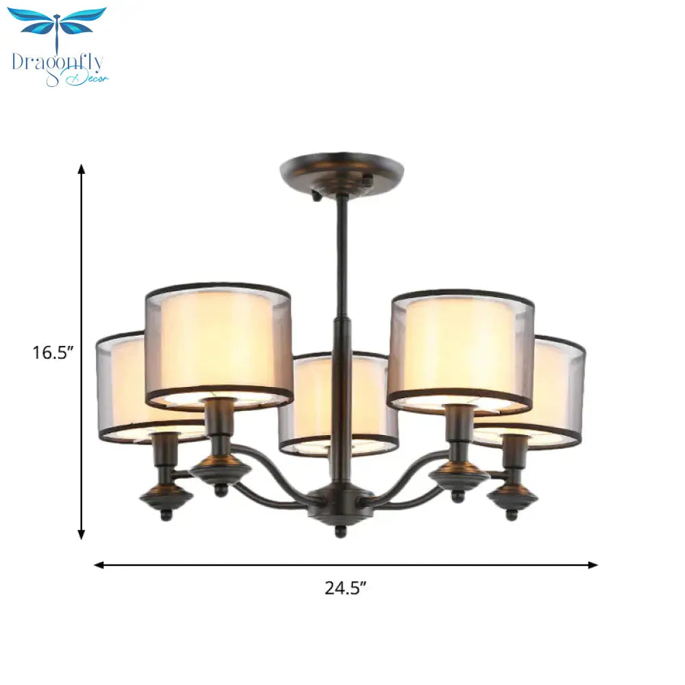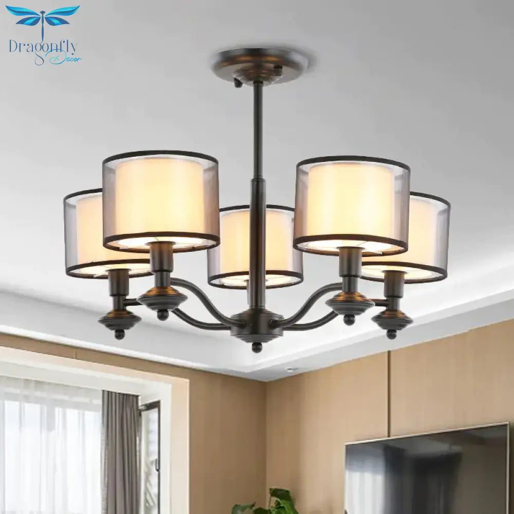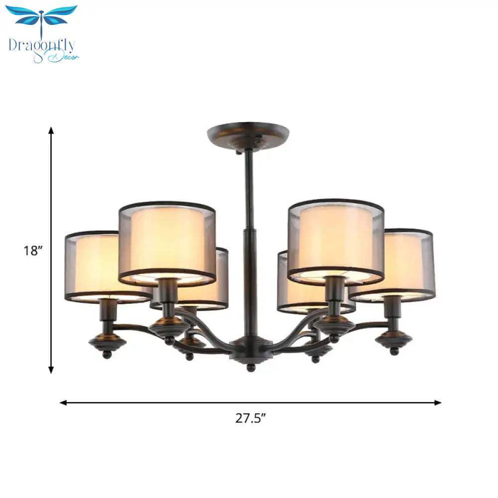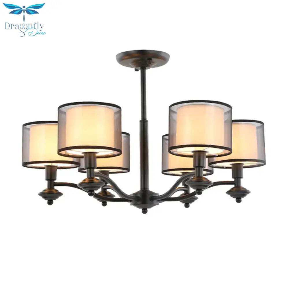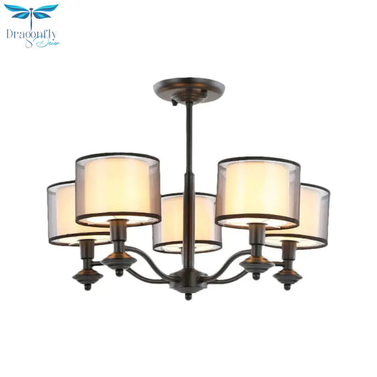 5/6 Bulbs Pendant Chandelier Traditional Double Drum Fabric Hanging Ceiling Light in Black for Bedroom