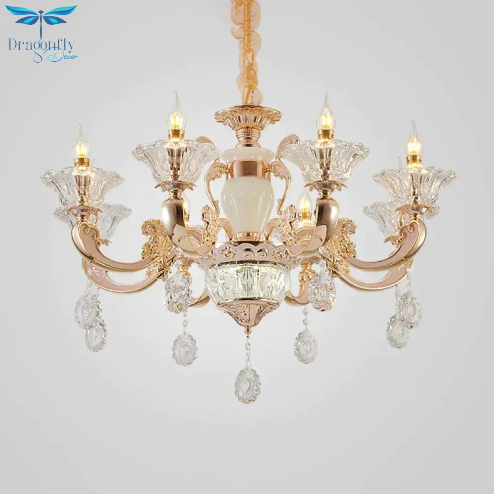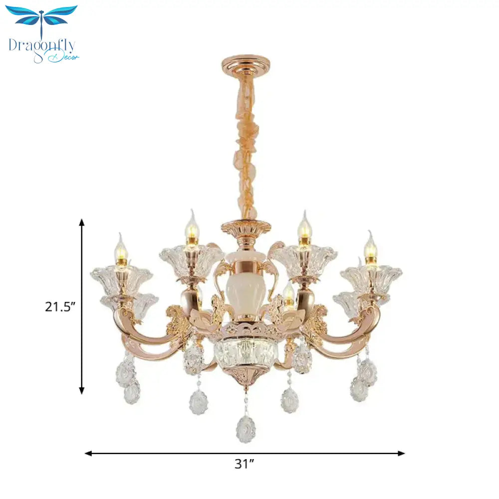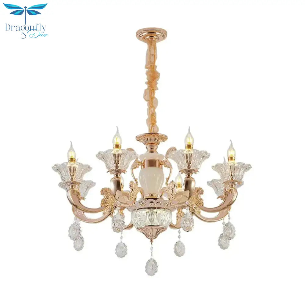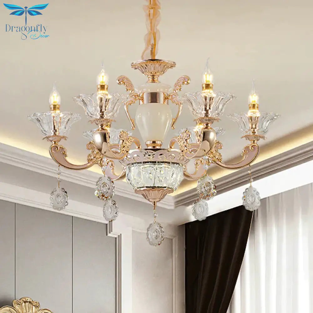 6/8 Bulbs Suspension Lighting Traditional Flower Clear Crystal Shade Chandelier with Curvy Arm in Gold