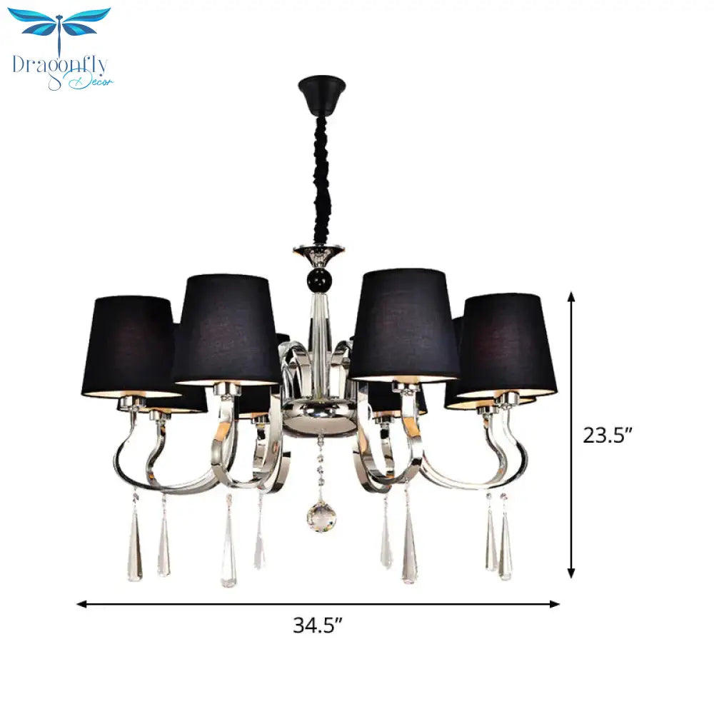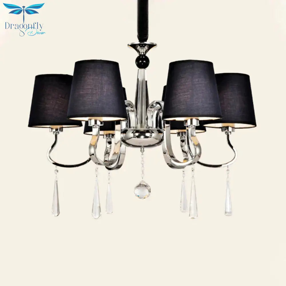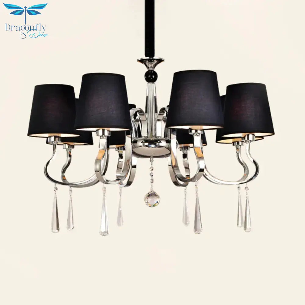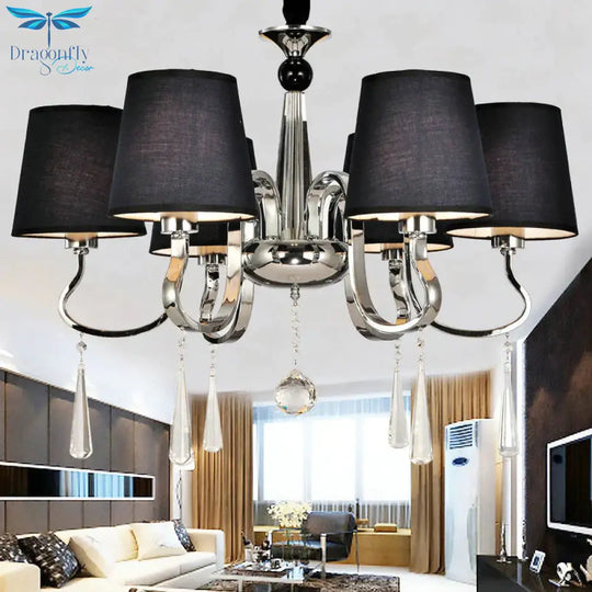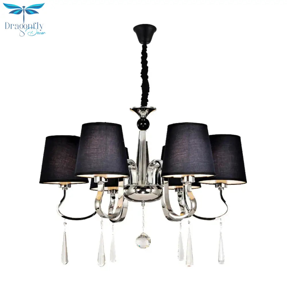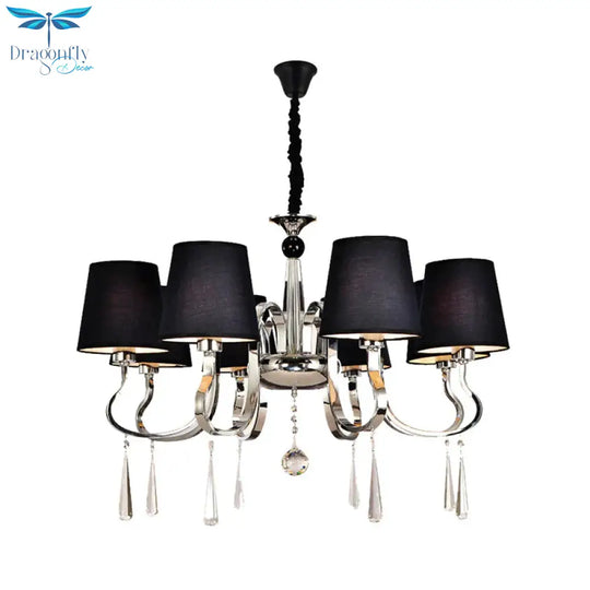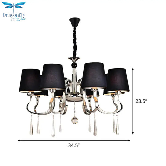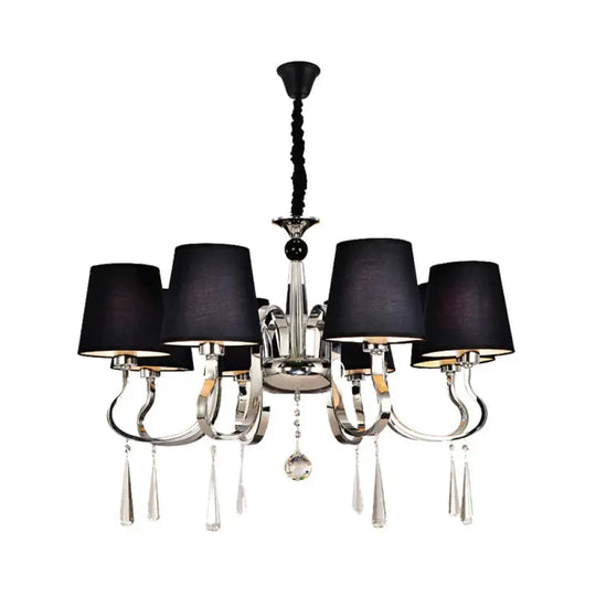 6/8 Heads Metal Suspension Lamp Country Conic Fabric Chandelier Pendant Light in Black with Crystal Droplet