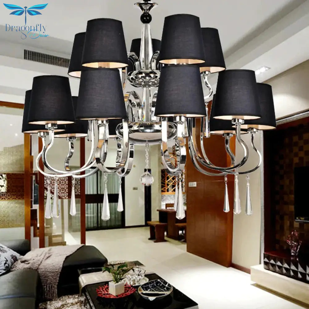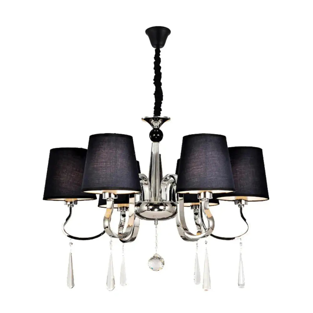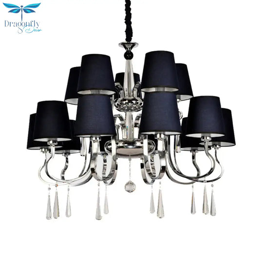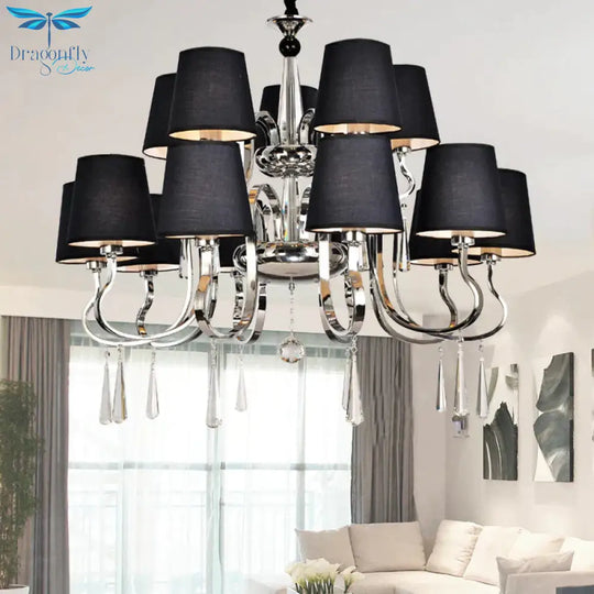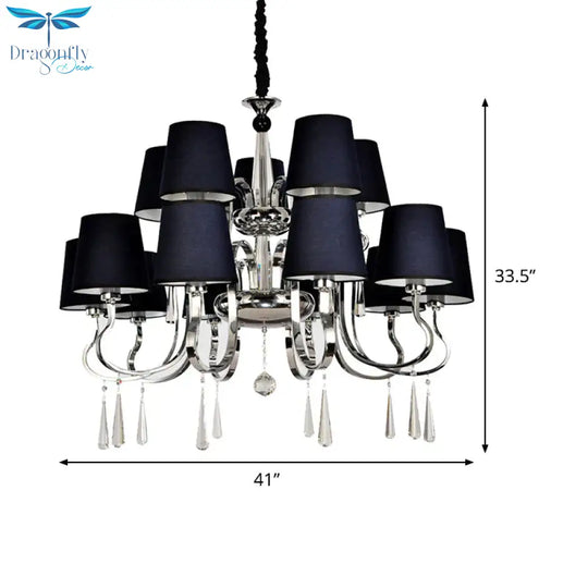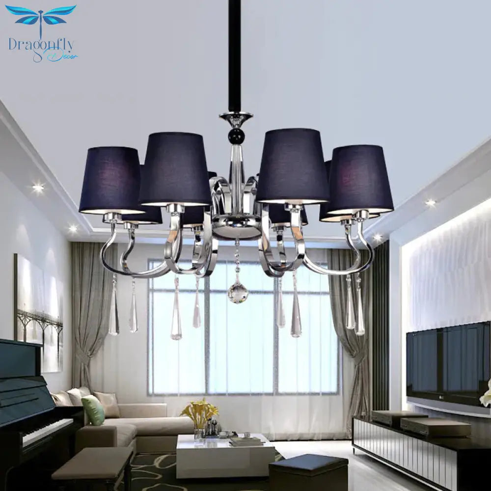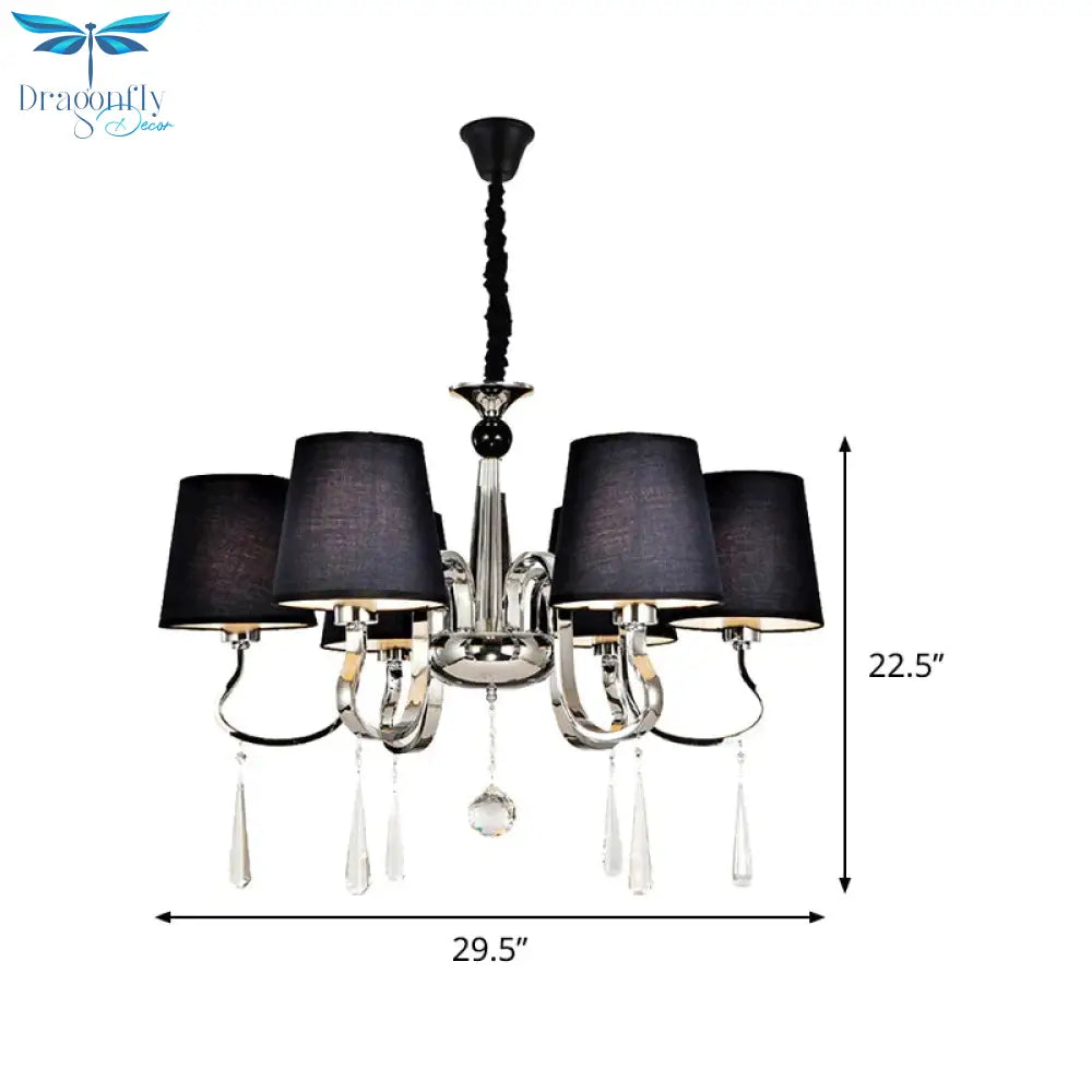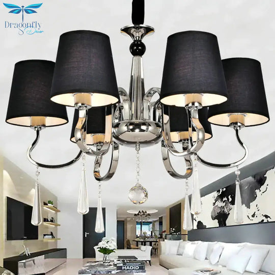 6/8 Heads Metal Suspension Lamp Country Conic Fabric Chandelier Pendant Light in Black with Crystal Droplet