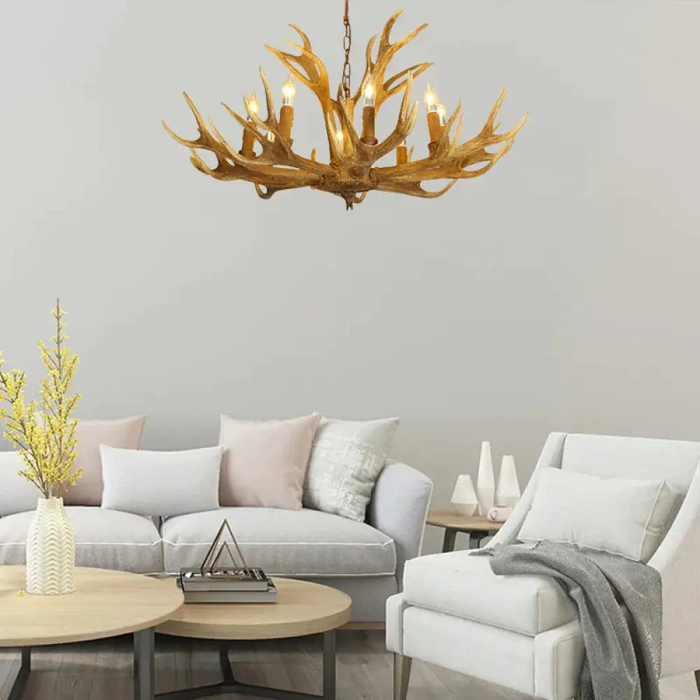 6/8-Light Resin Chandelier Lamp Rural Brown Antlered Shape Living Room Hanging Pendant with Open Bulb Design