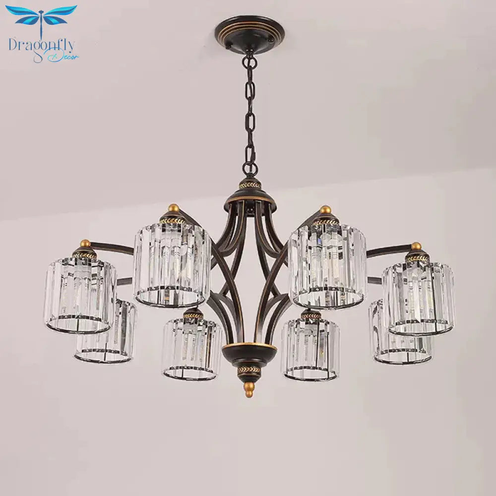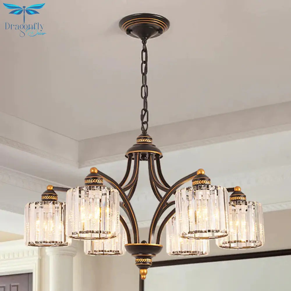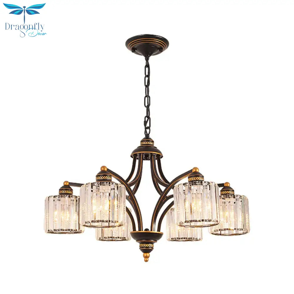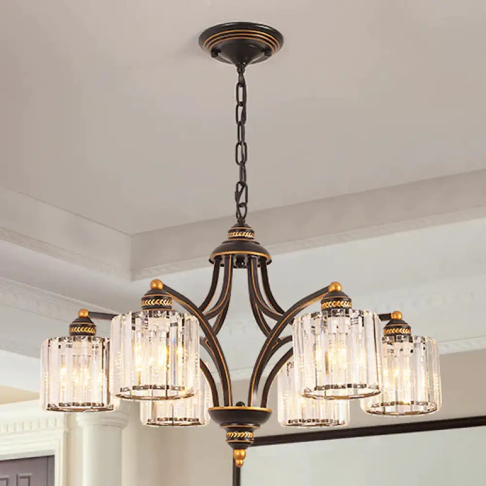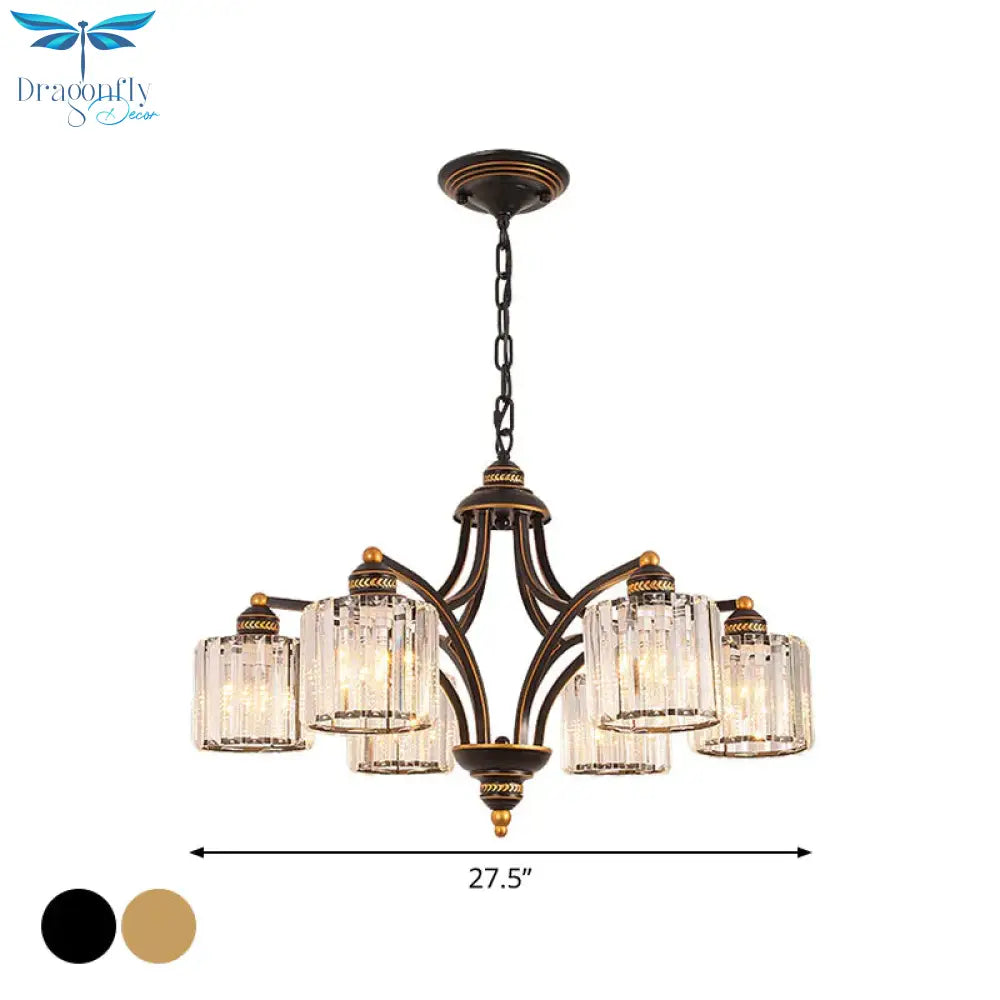 6/8 Lights Chandelier Retro Cylinder/Bell Clear Crystal/White Glass Hanging Pendant in Black/Gold for Living Room