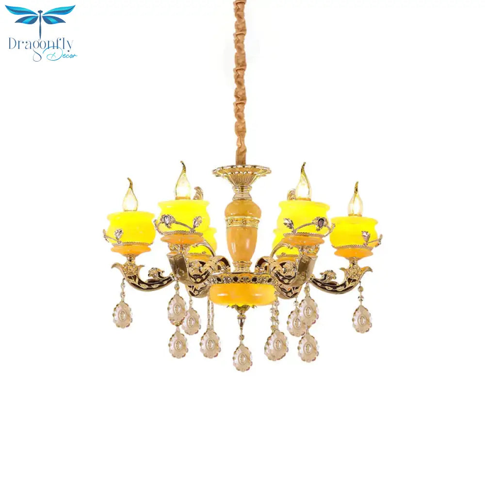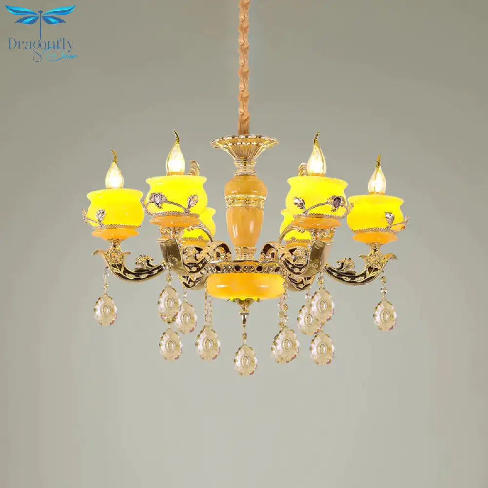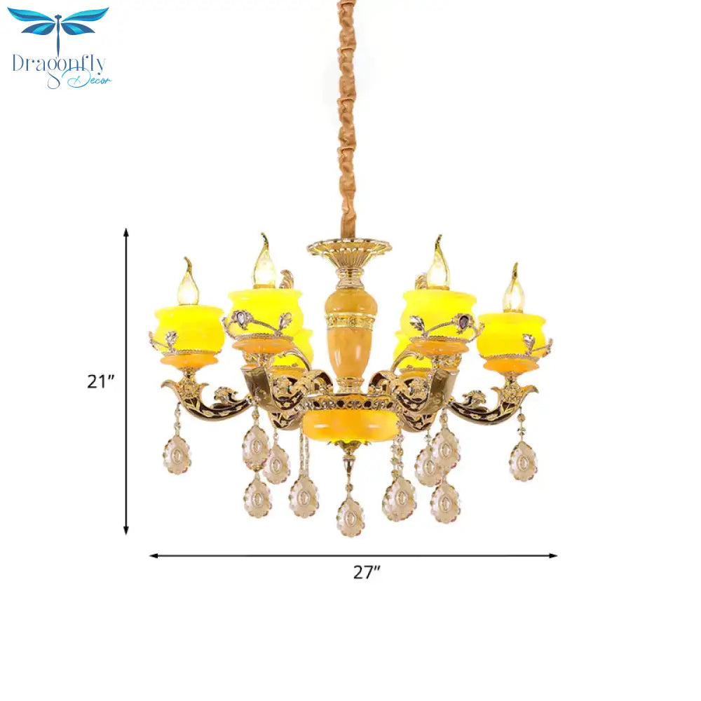 6/8 Lights Jade Ceiling Chandelier Antique Gold Candelabra Dining Room Pendant with Dangling Crystal
