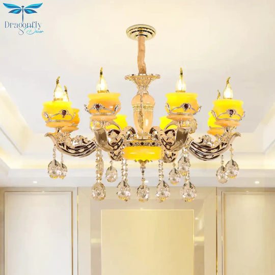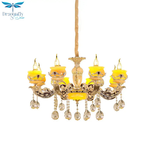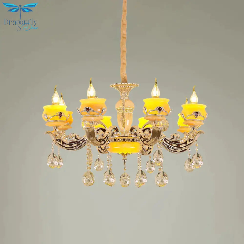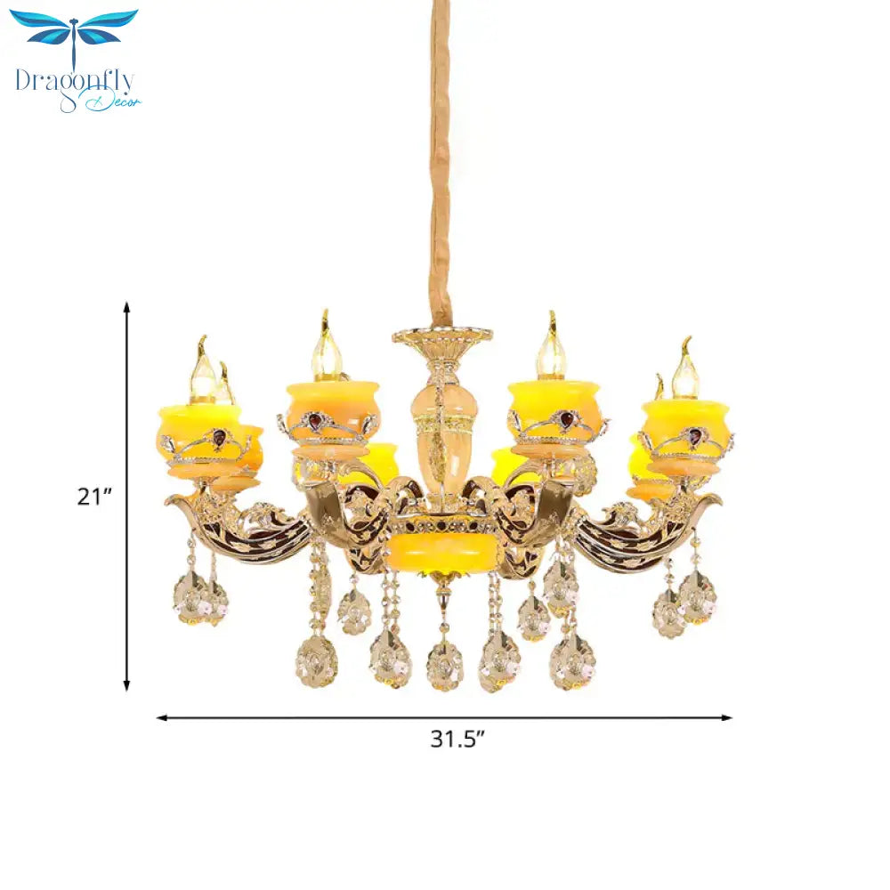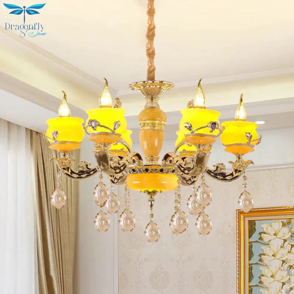 6/8 Lights Jade Ceiling Chandelier Antique Gold Candelabra Dining Room Pendant with Dangling Crystal