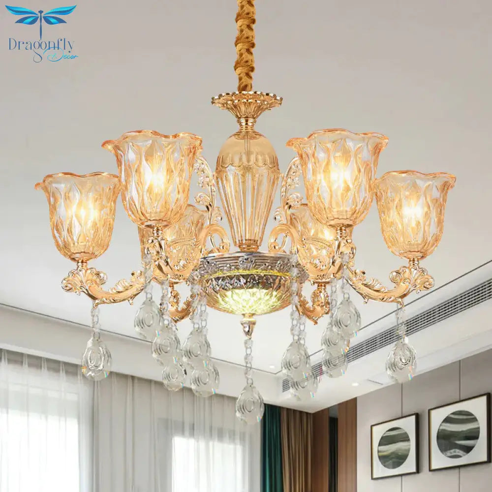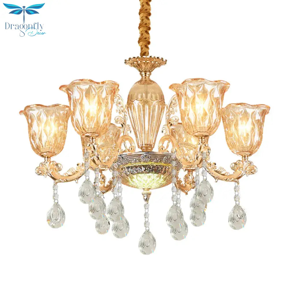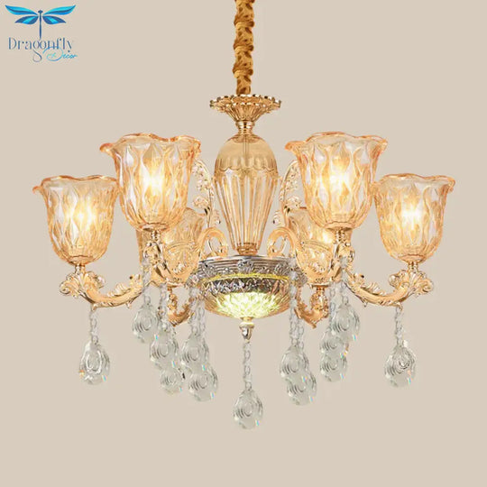 6 Bulbs Bell Up Chandelier Traditional Gold Clear Pebble Glass Hanging
