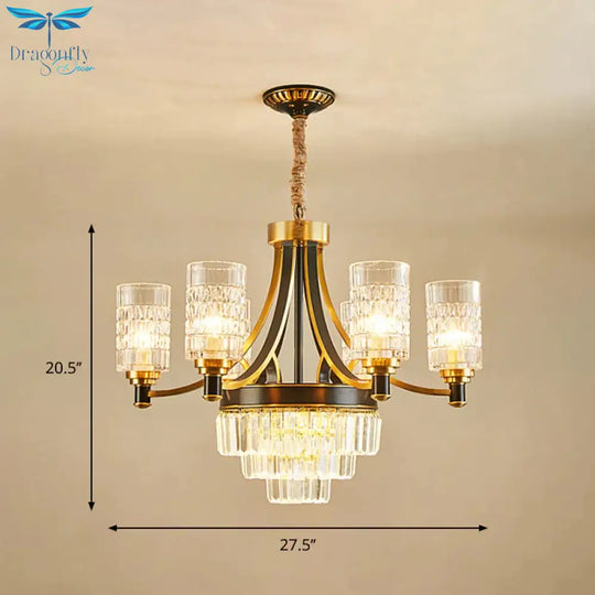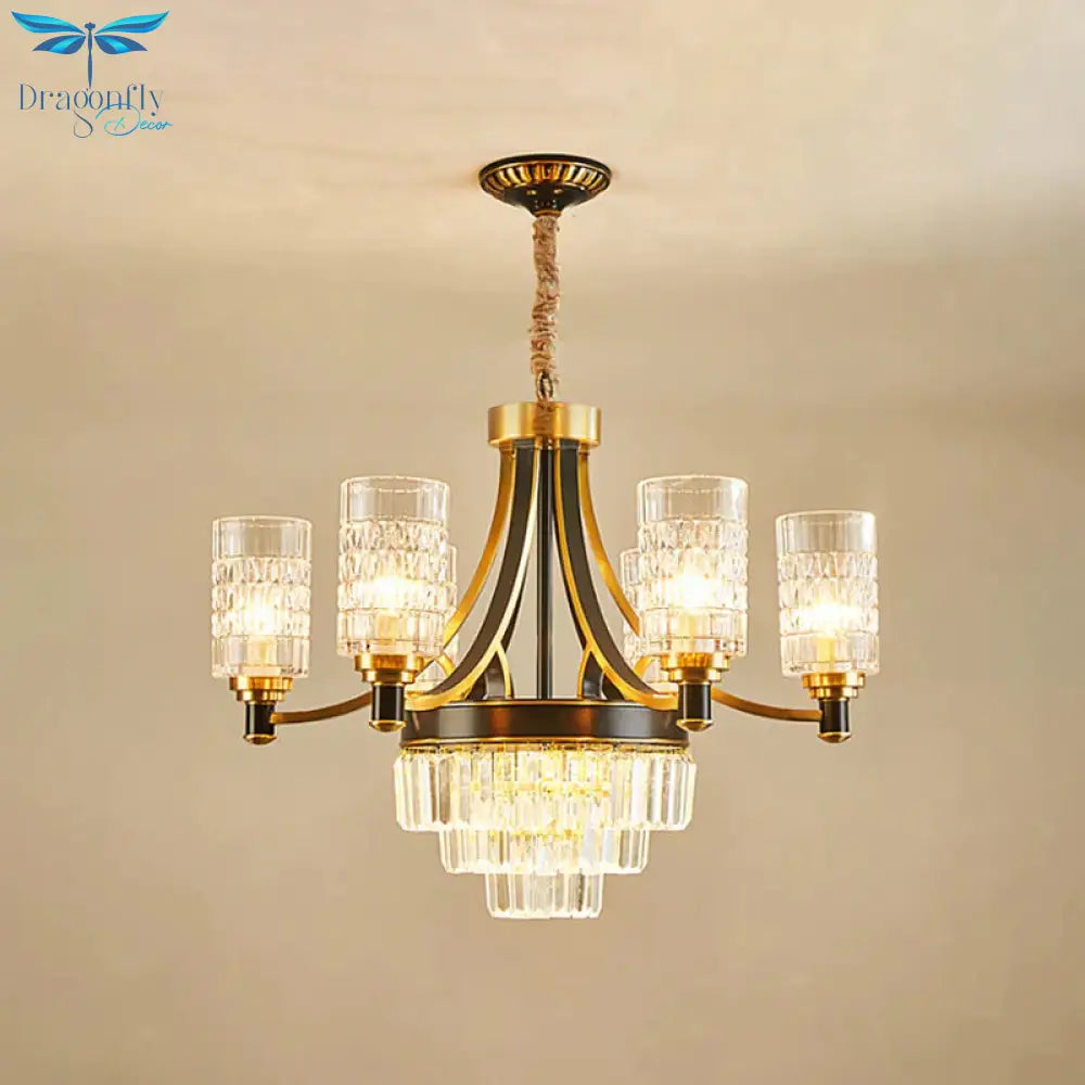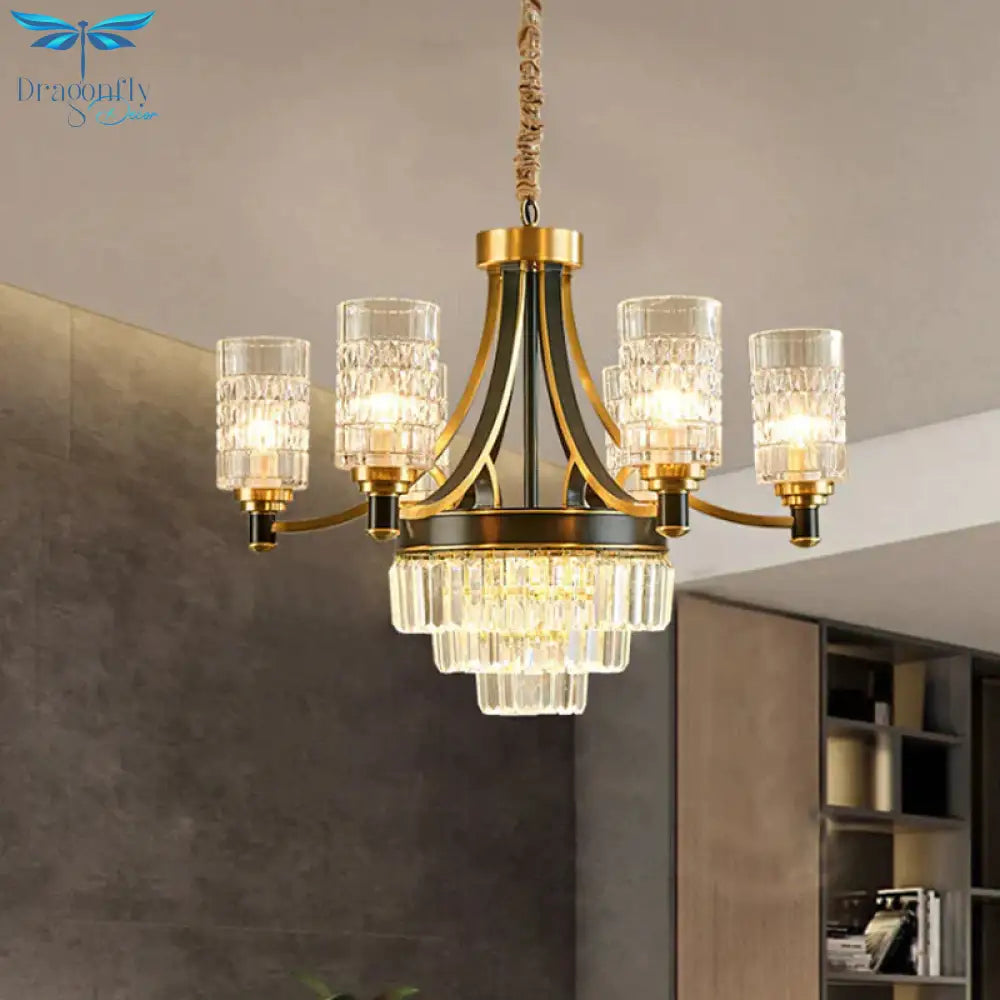 6 Bulbs Ceiling Pendant Retro Living Room Chandelier With Cylinder Clear Glass Shade In Gold
