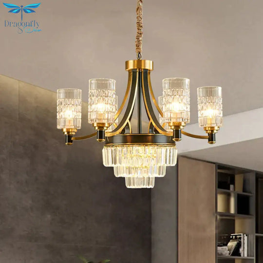 6 Bulbs Ceiling Pendant Retro Living Room Chandelier with Cylinder Clear Glass Shade in Gold