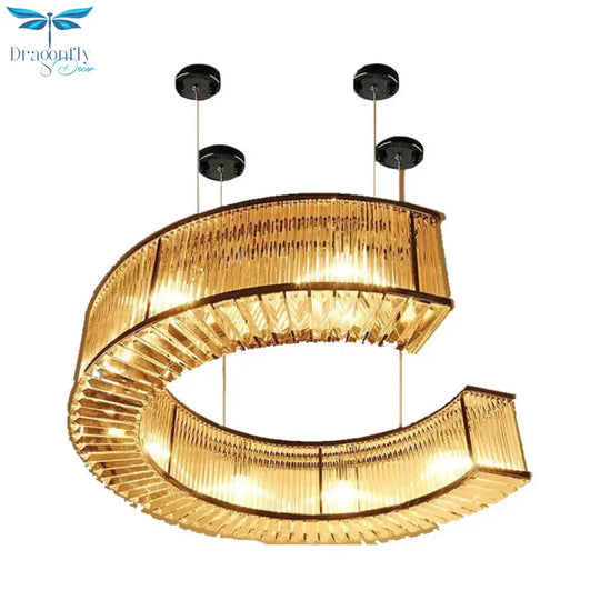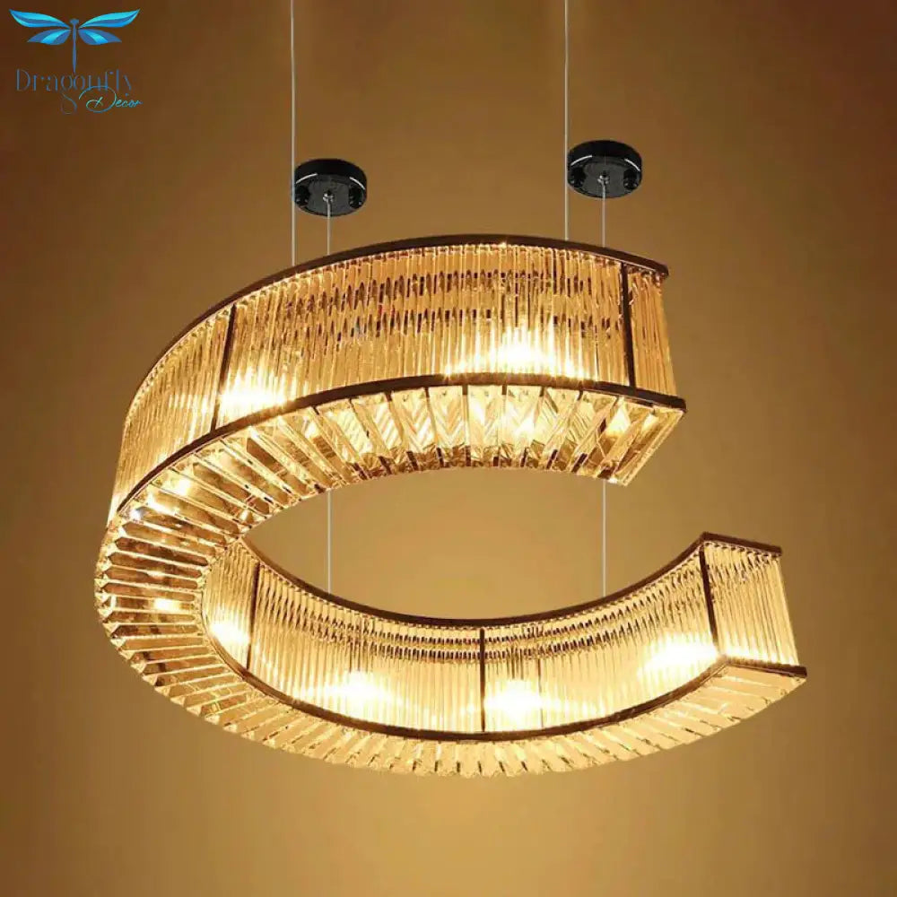 6 Bulbs Crystal Block Hanging Chandelier Vintage Gold C-Shaped Living Room Pendant Lighting Fixture