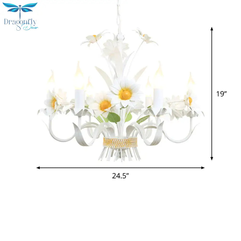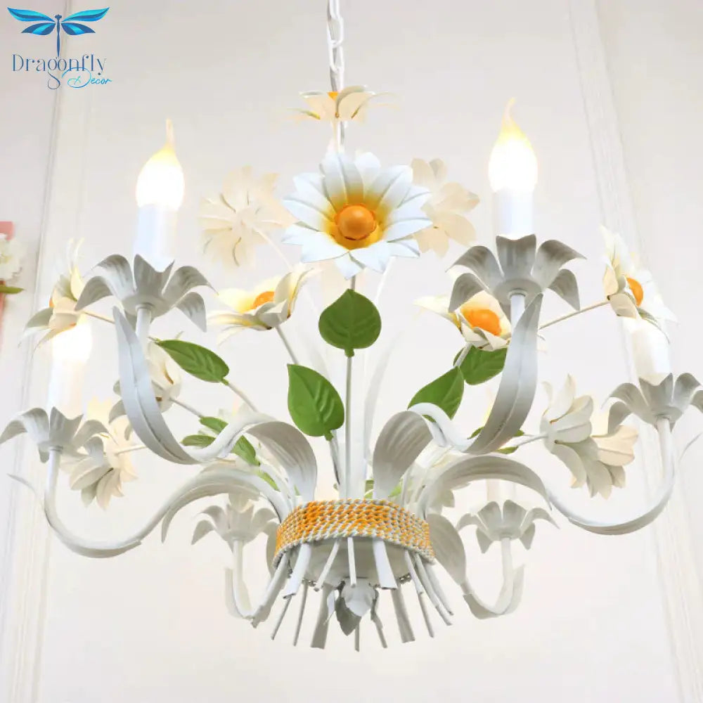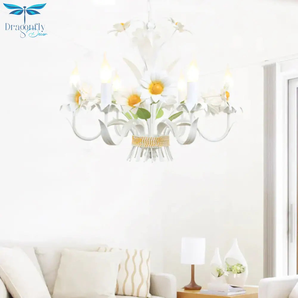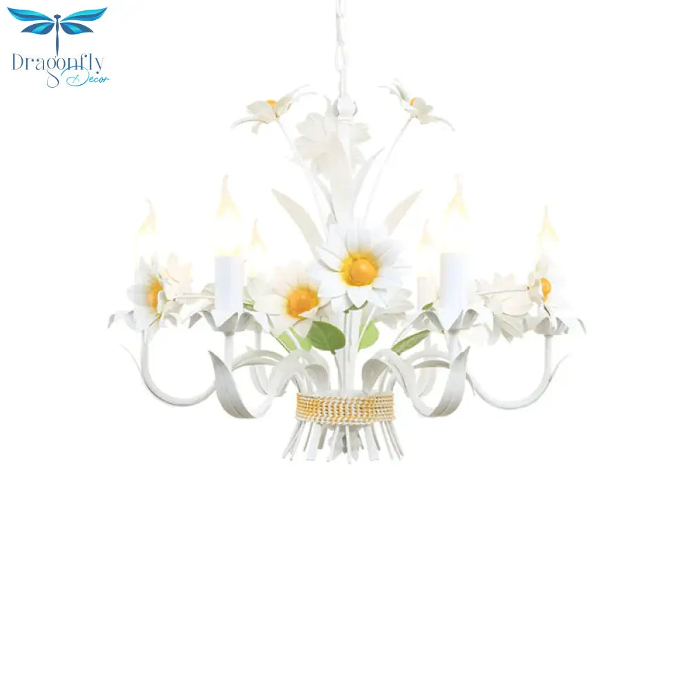 6 Heads Daisy Flower Bunch Chandelier American Garden White Iron Hanging Light with Candle Design