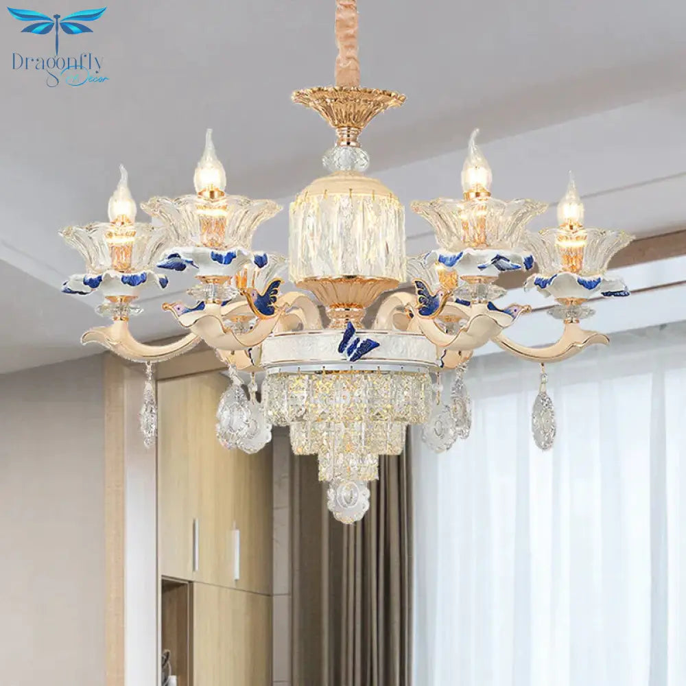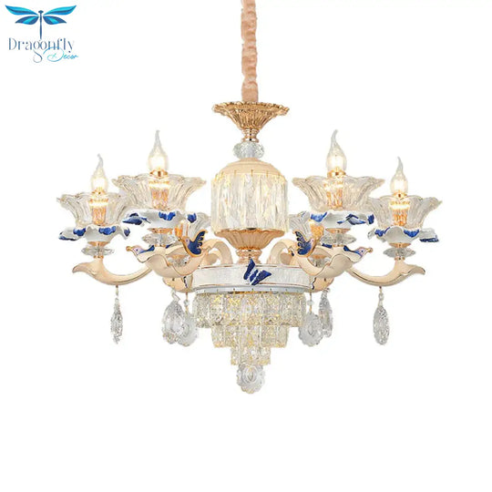 6 Heads Dining Room Chandelier Lamp Tradition Gold Hanging Light Fixture with Flared Clear Glass Shade