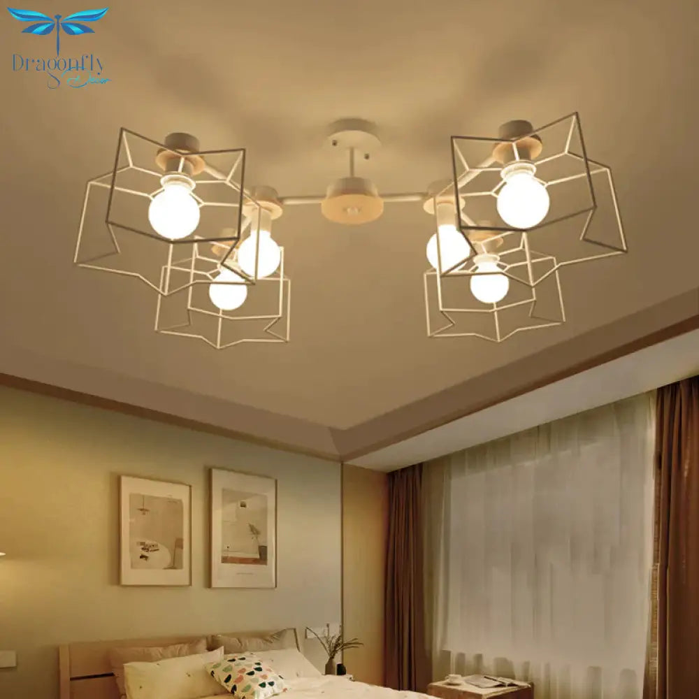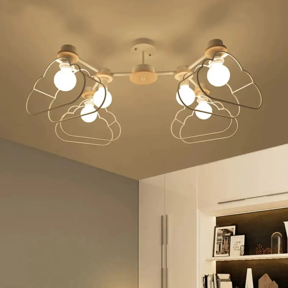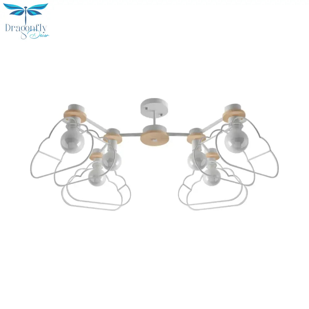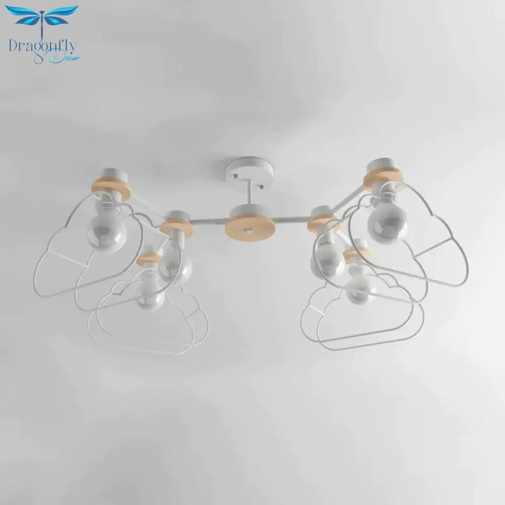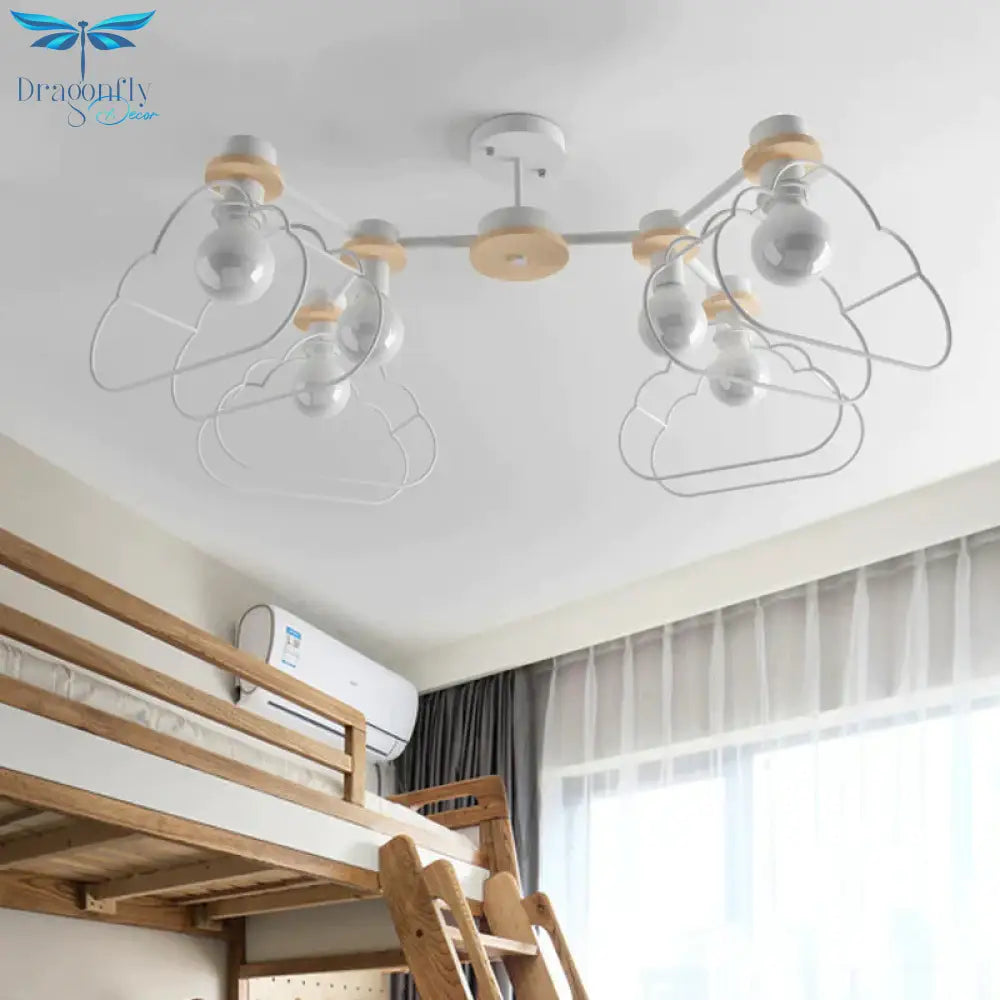 6-Light Bedroom Hanging Chandelier Cartoon White Pendant Lamp with Cloud/Star Iron Cage and Wood Cap