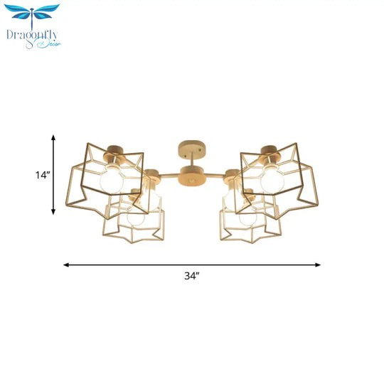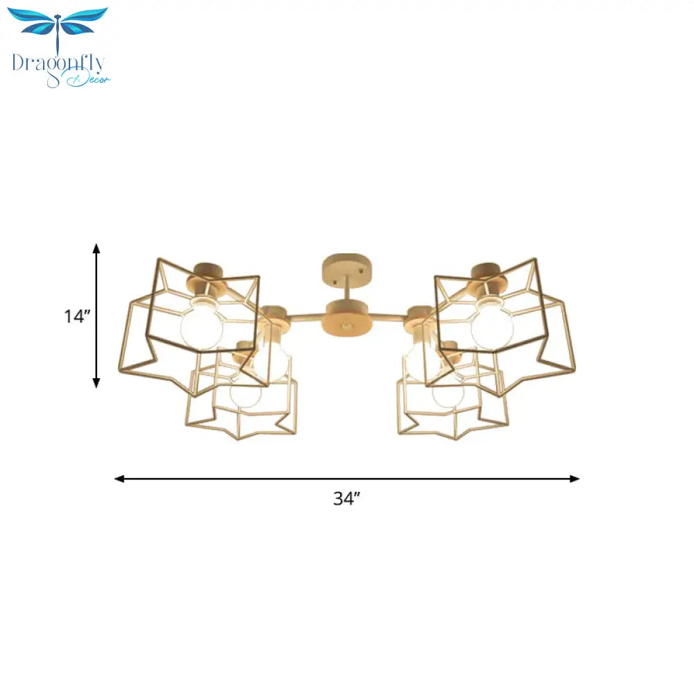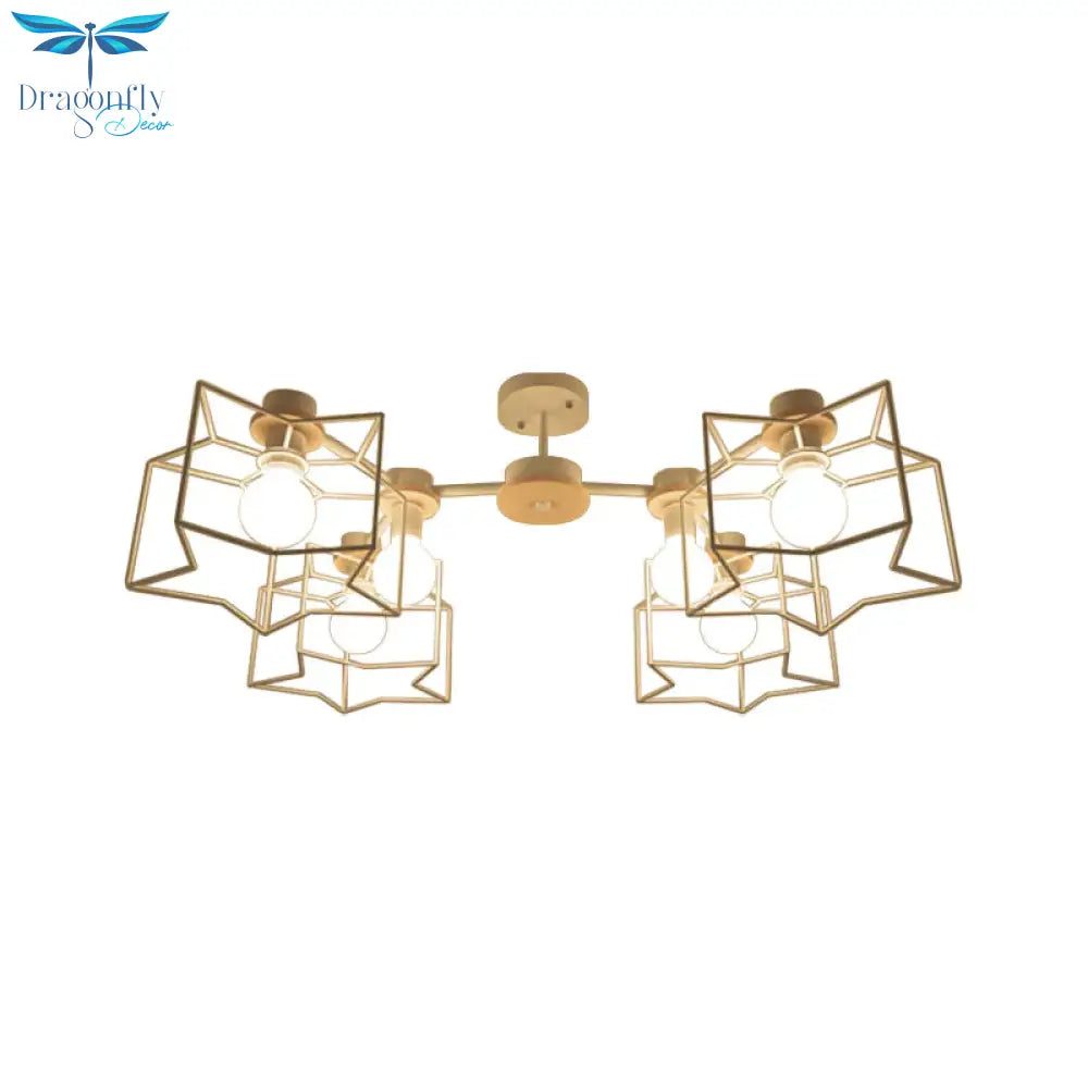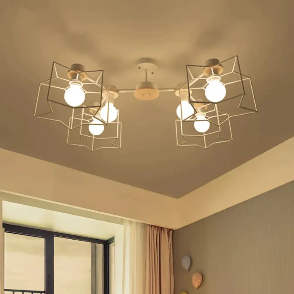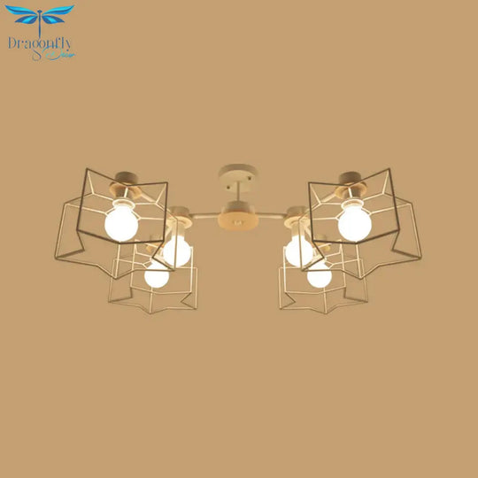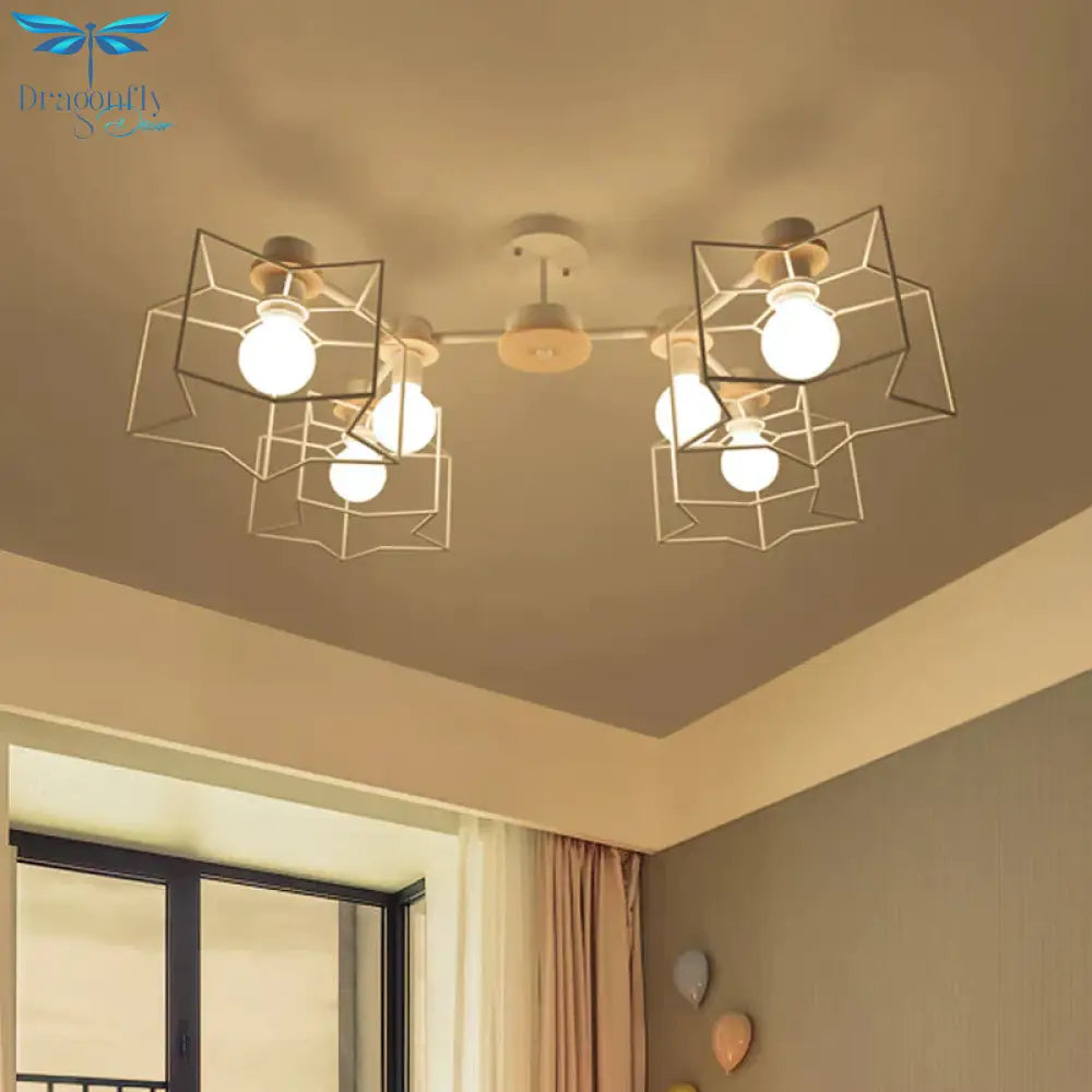 6-Light Bedroom Hanging Chandelier Cartoon White Pendant Lamp with Cloud/Star Iron Cage and Wood Cap
