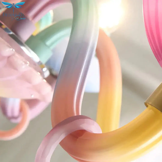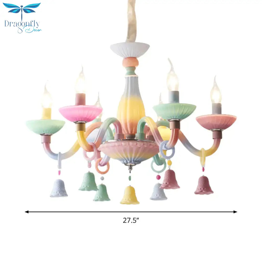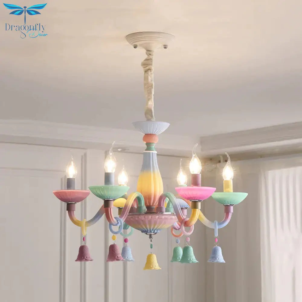 6 Lights Candle Hanging Light with Bell Deco Modern Glass Colorful Chandelier for Girl Bedroom