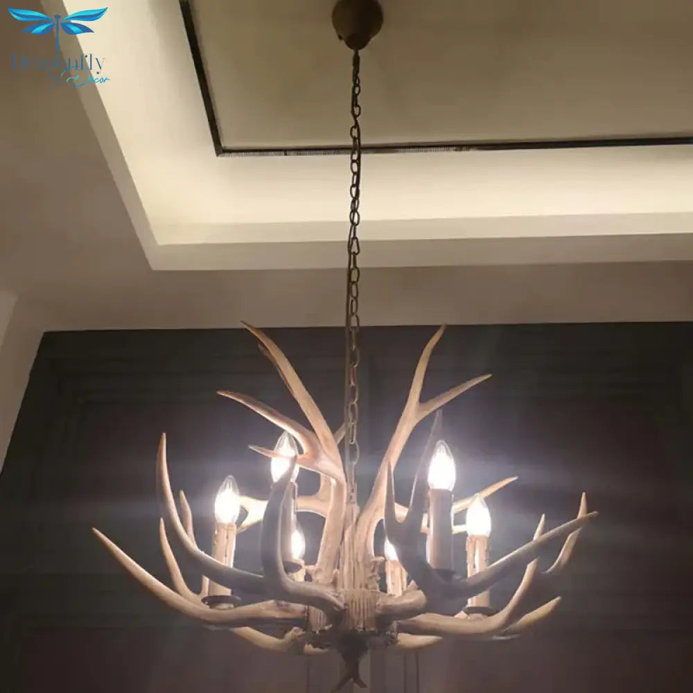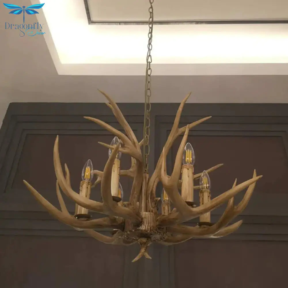 6 Lights Deer Horn Ceiling Pendant Rural Brown Resin Chandelier Lamp f