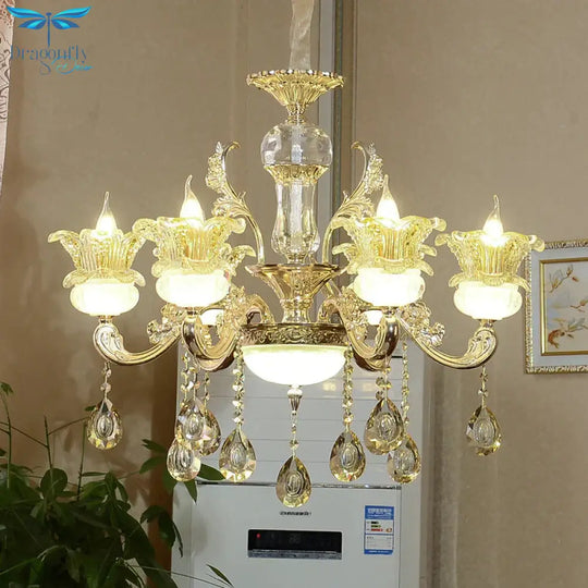 6 Lights Floral Hanging Chandelier Mid-Century Gold Crystal Ceiling Suspension Lamp