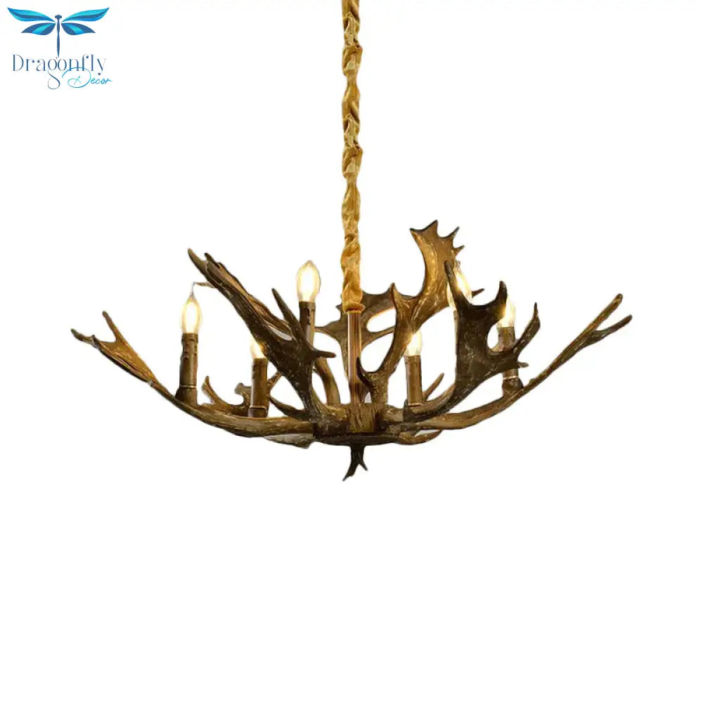 6 Lights Resin Chandelier Lamp Farmhouse Brown Candle Shape Living Room Down Lighting Pendant