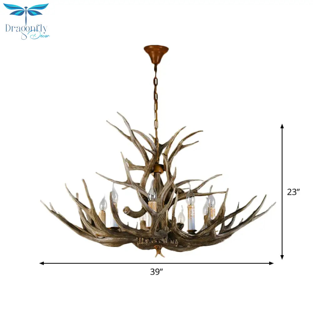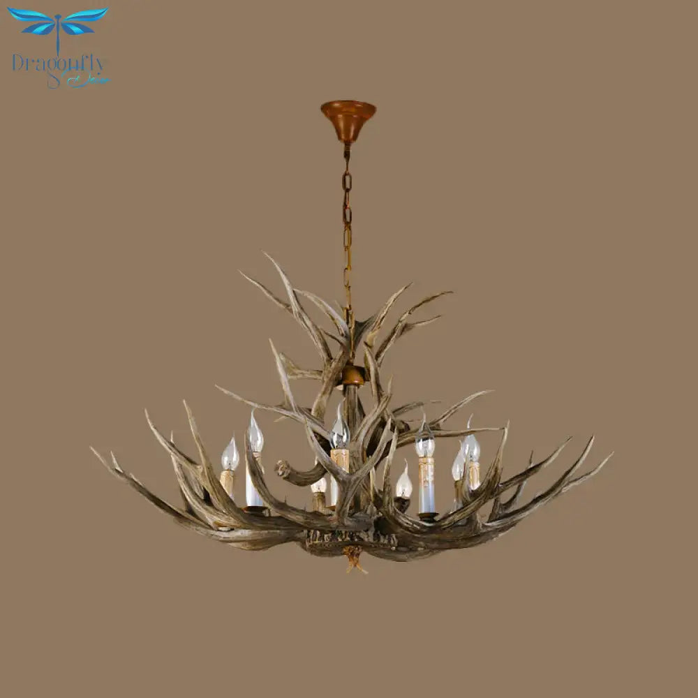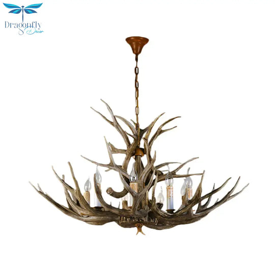 8 Bulbs Resin Pendant Lighting Rural Brown Faux Antler Living Room Chandelier with Candle Design