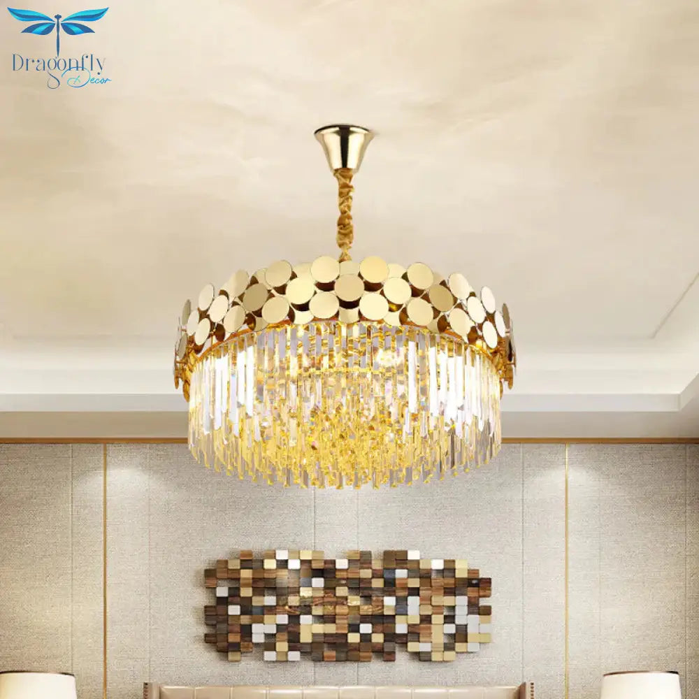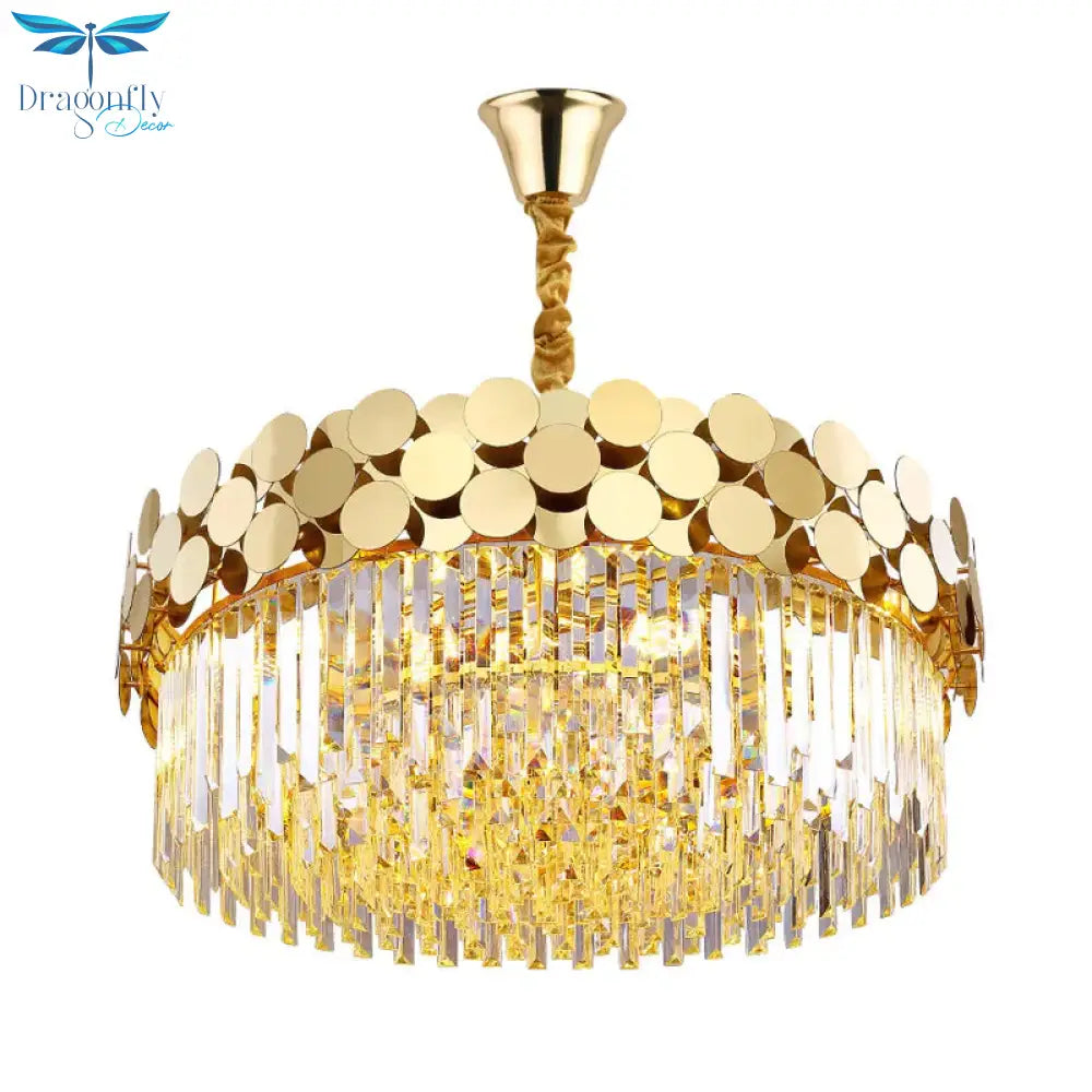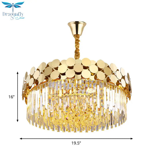 9 Heads Chandelier Lighting Country Drum Crystal Pendant Light Kit in Gold with Metal Dotted Design