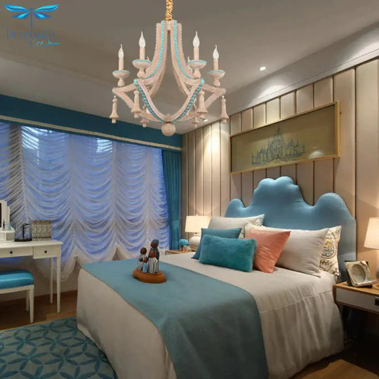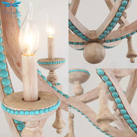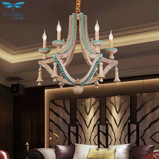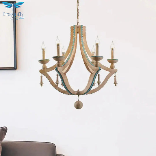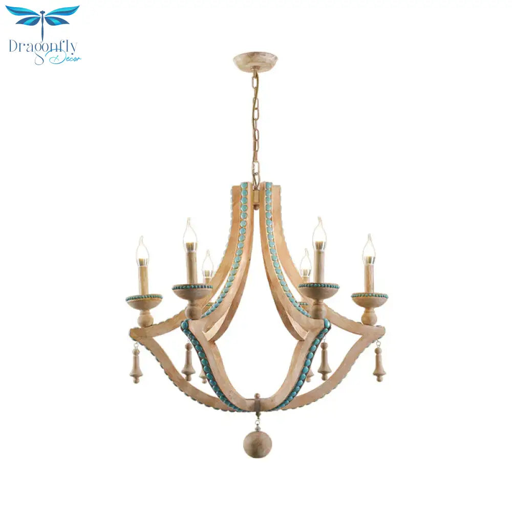 Beige Candle Ceiling Chandelier Traditional Wood 6 Heads Hanging Light