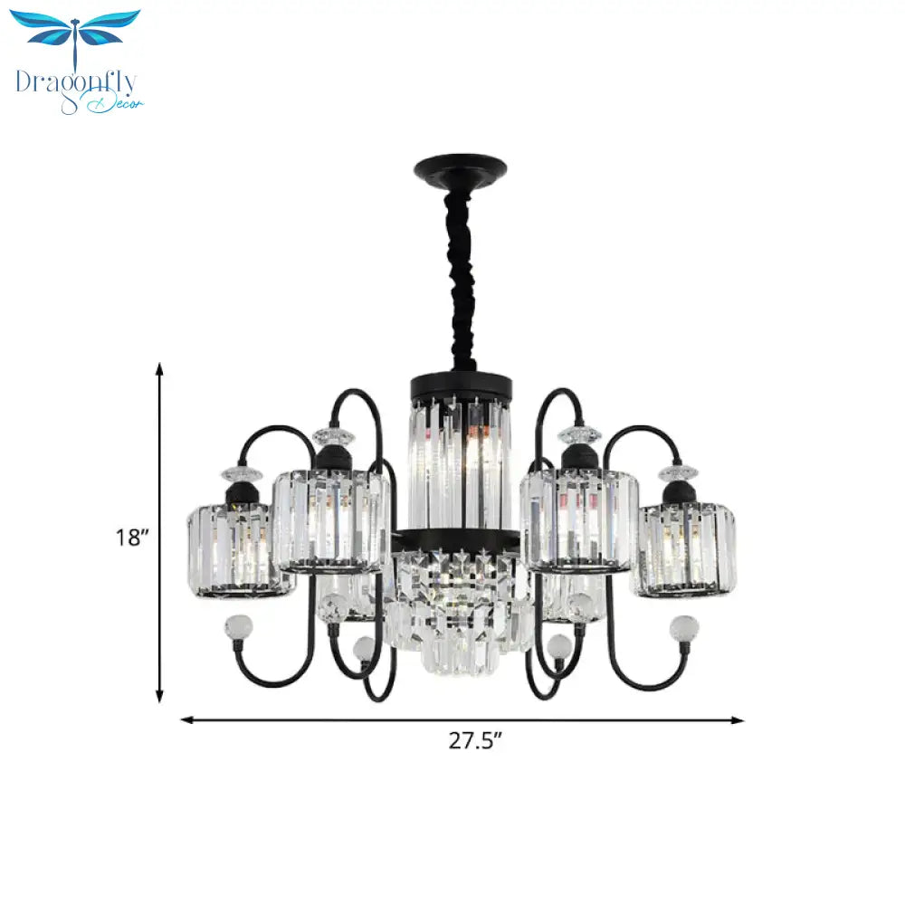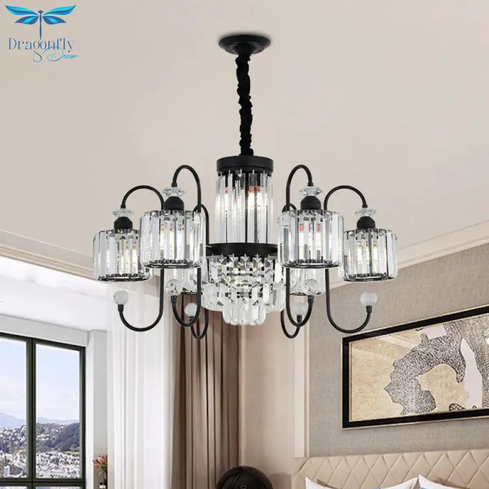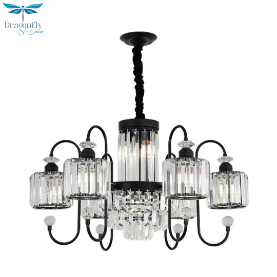 Black 6 Lights Suspension Lighting Modern Crystal Cylindrical Chandelier with Oval Arm