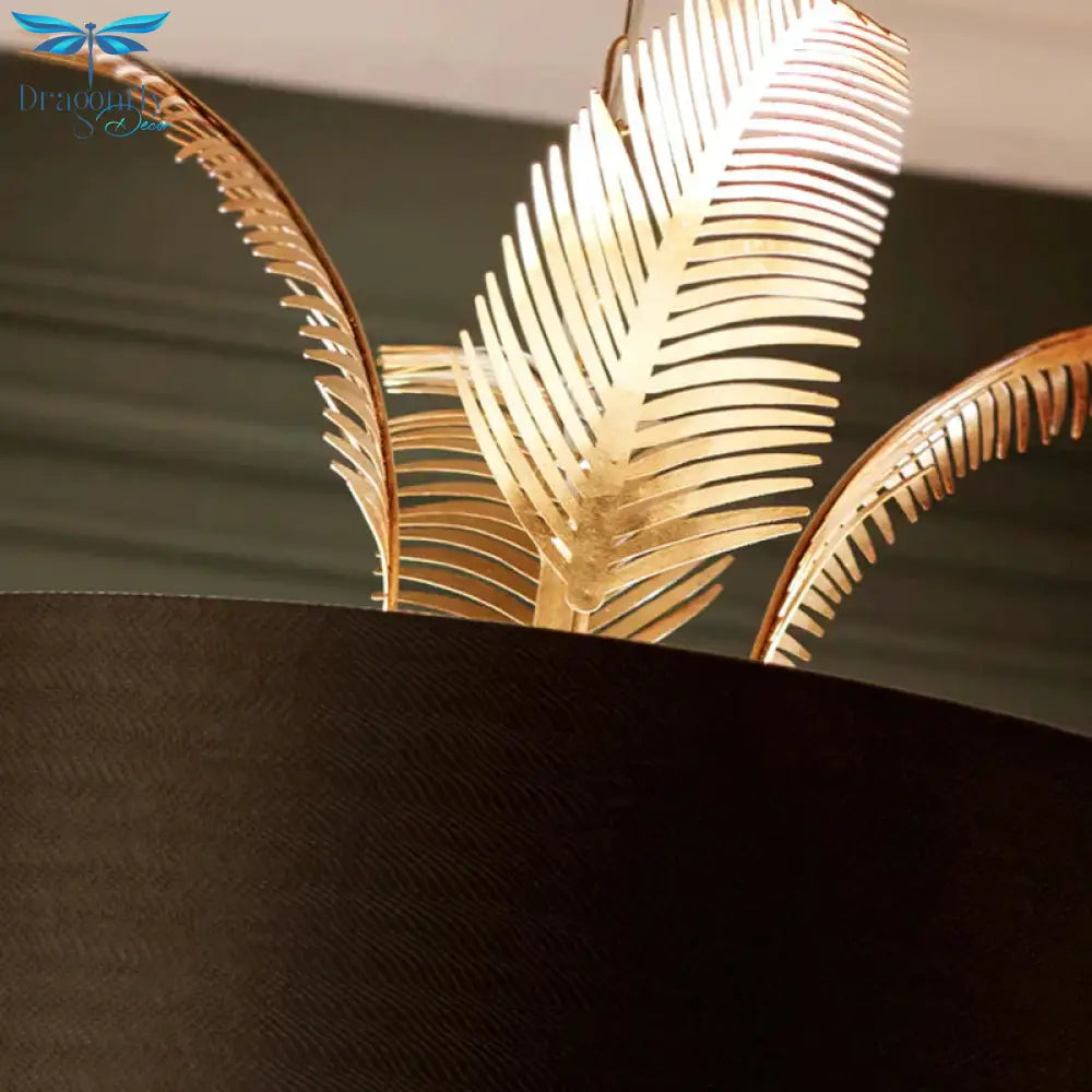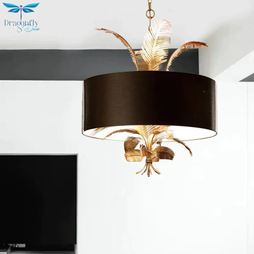 Black Country Drum Chandelier With Leaf Decoration - 6 - Light Fabric Hanging Ceiling Light For