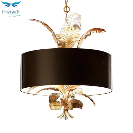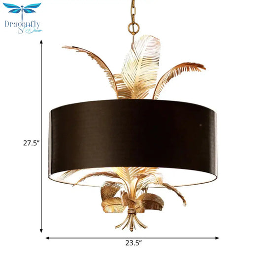 Black Country Drum Chandelier with Leaf Decoration - 6-Light Fabric Hanging Ceiling Light for Dining Room