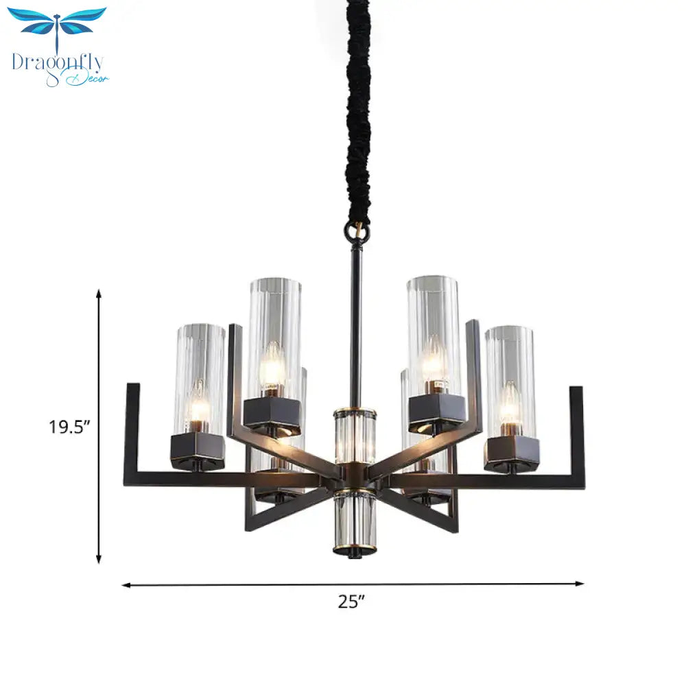 Black Radial Chandelier Vintage Metal 6-Bulb Dining Table Suspension Pendant Light with Flute Prismatic Glass Shade
