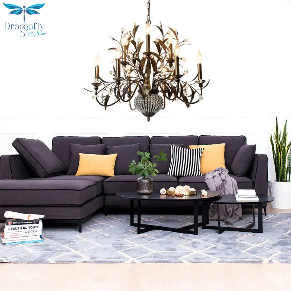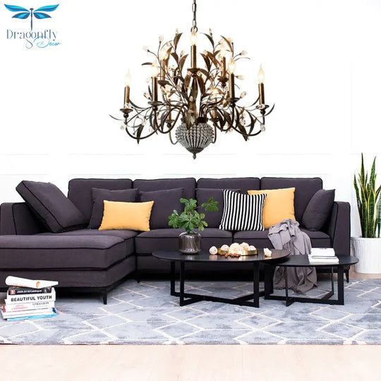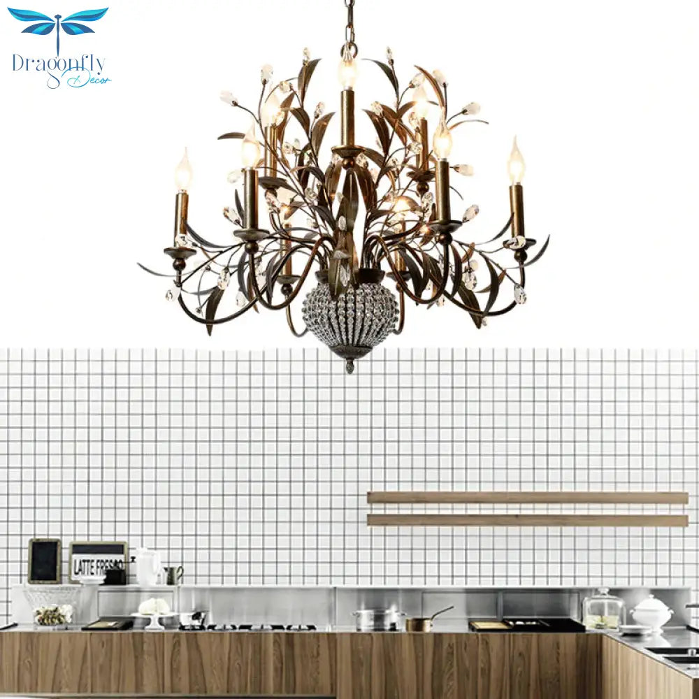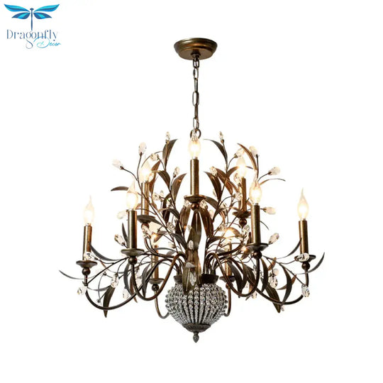 Black Spur Chandelier Lamp Modernism Crystal 9 Heads Pendant Lighting Fixture with Metal Leaf