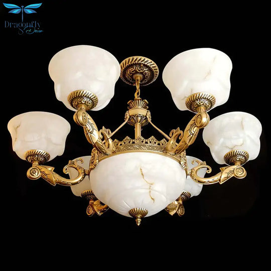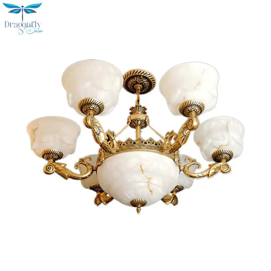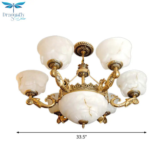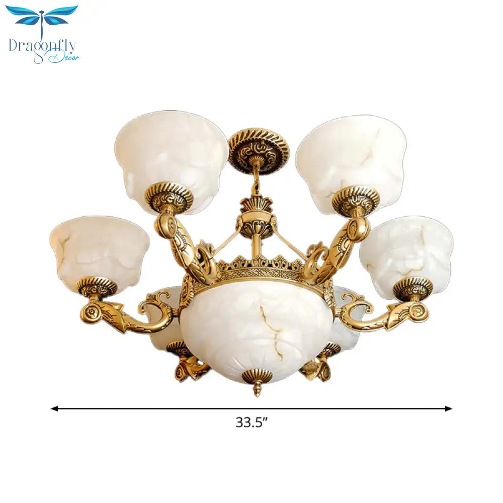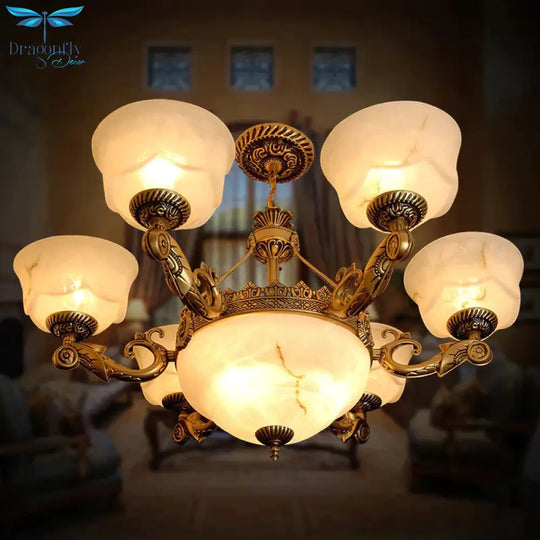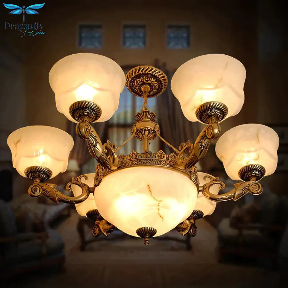 Bowl Dining Room Drop Lamp Antiqued White Glass 9-Light Brass Chandelier Light Fixture
