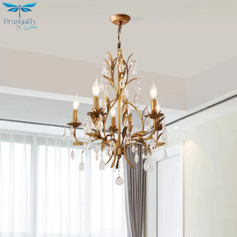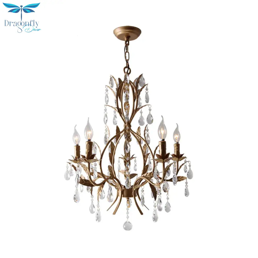 Brass Candle Chandelier Lamp Retro 5 Heads Metal Ceiling Pendant Light with Crystal Teardrop