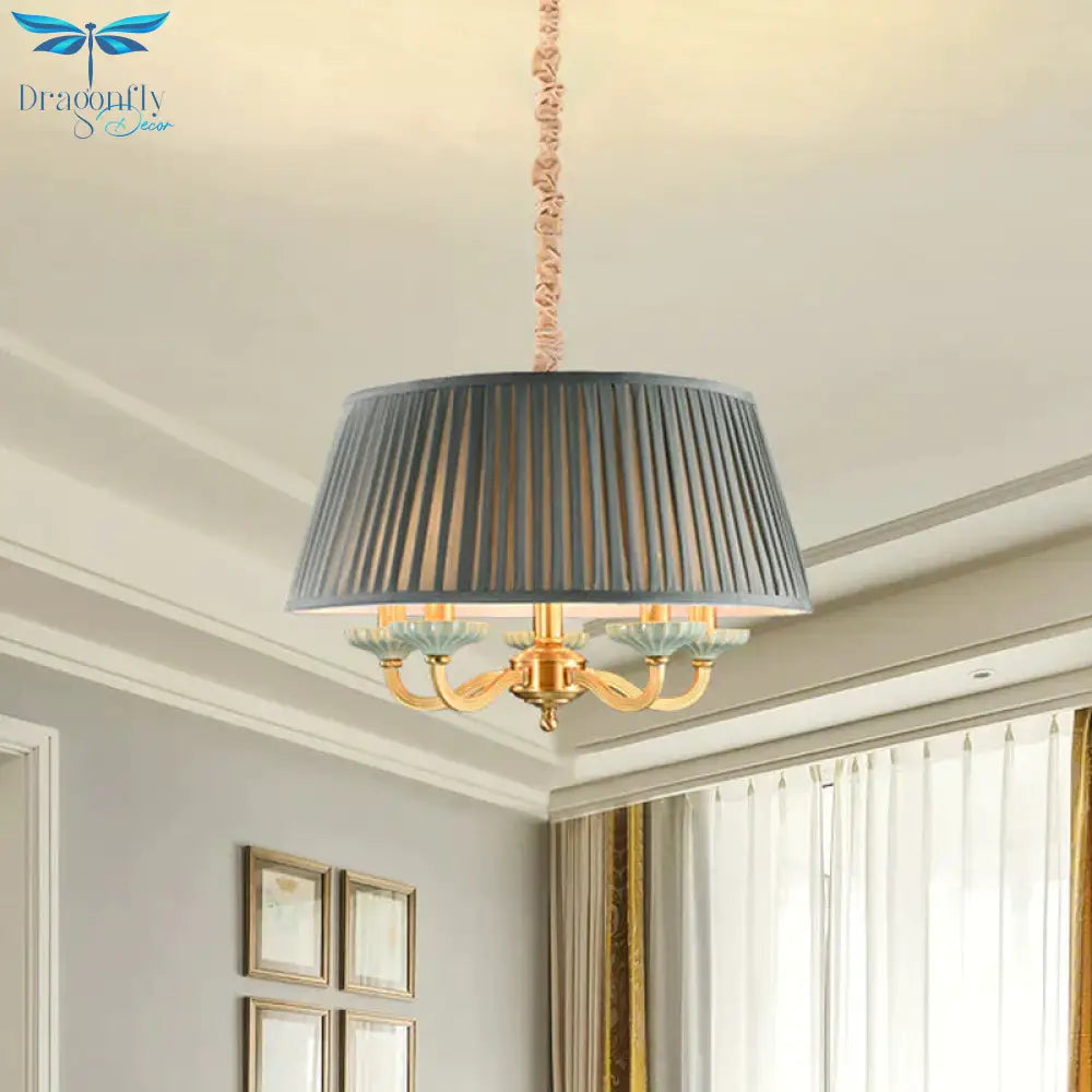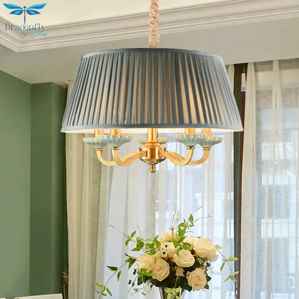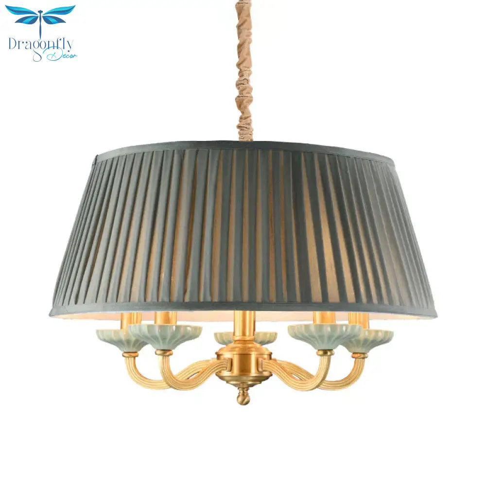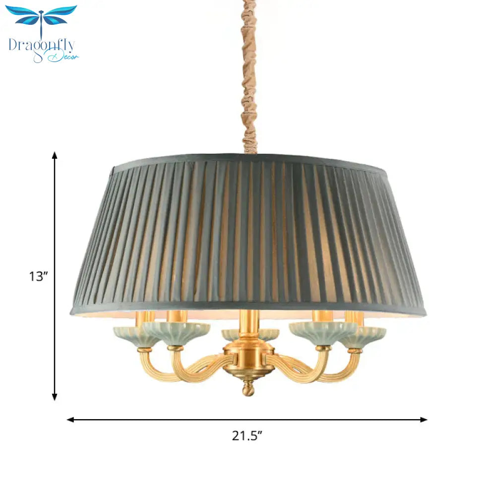 Brass Pleated Drum Chandelier Lighting Rustic Fabric 5 Heads Dining Ro