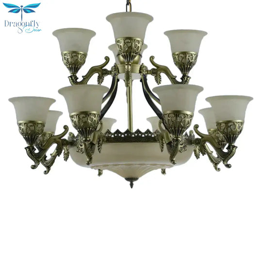 Bronze Bell Up Chandelier Light Traditional Opaline Glass 15 Bulbs Dining Room Pendant Light